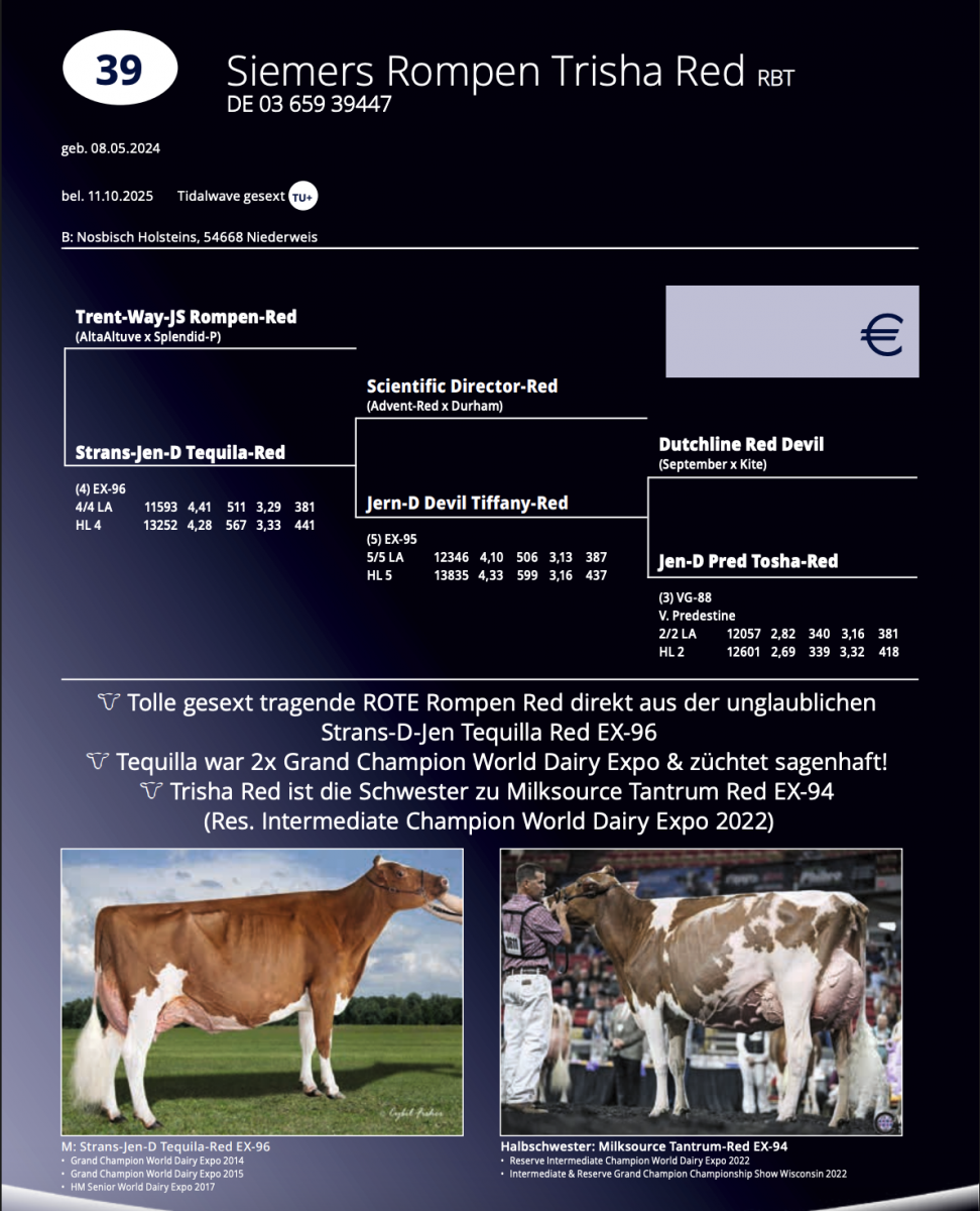 February the 26th is it time for the Schau der Besten in the Niedersachsenhalle in Verden, Germany. One of the greatest shows in Germany with a super ambience and big quality of the cows. The night before the show Masterrind will have an auction with top genetics. Several Eurogenes members have offered the very best for this auction. Colonia Cows and Nosbisch Holsteins are selling an early red&white and polled Sainz P daughter with +158 RZG as Lot 22. Her full sister was topseller of the Highlight Sale 2026, she is sold for 27.500 EUR.