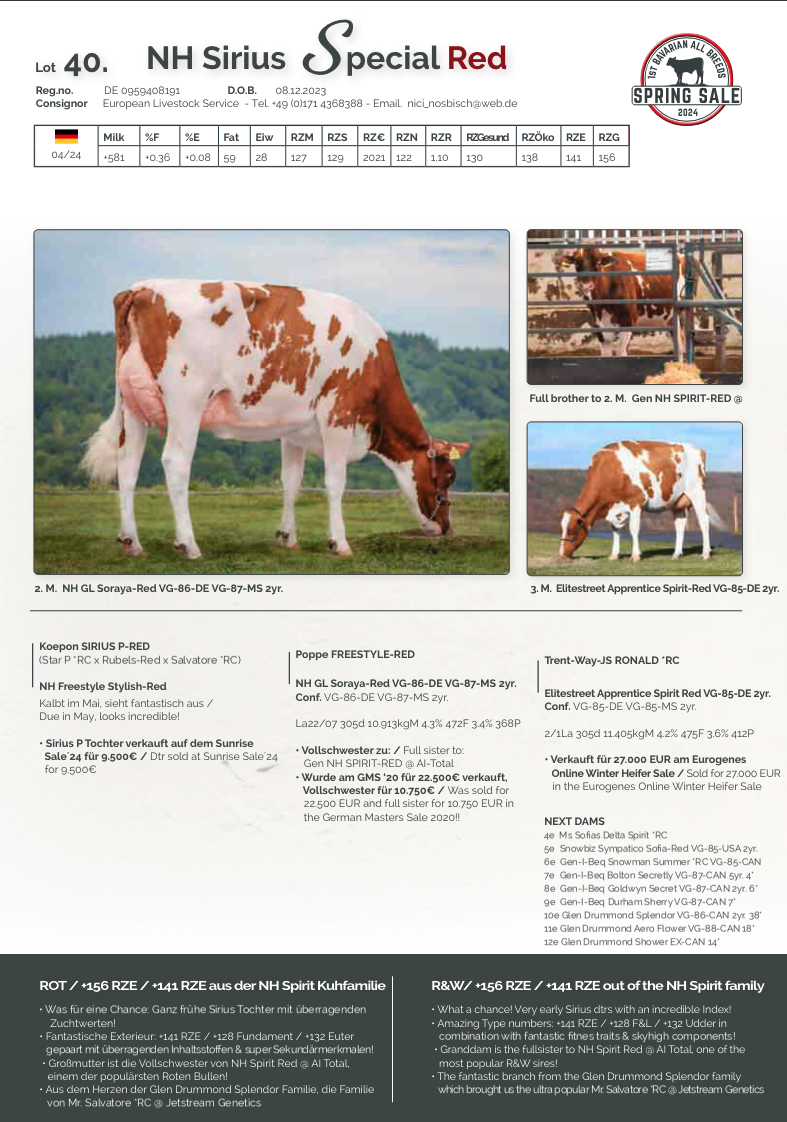 Only a few days left until the first edition of the Bavarian All Breeds Spring Sale 2024 starts! Eurogenes members have offer their very best which will open doors for you Saturday the 27th of April. Take adventage and bid last on these great lots selling, like: Lot 34. Mox Estelle 1 VG-86-DE 2yr., a fresh King Doc daughter from the Krull Broker Elegance EX-96-USA family. She is a close family member to the dam of Wilt Emilio @ Ascol (the former #1 PTAT bull in the breed!): Wilt Emy EX-95-FR and to Wilt Fitz Elaya EX-96-FR, the Grand Champion B&W Agrimax 2019, 2022 & 2023 and H.M. Grand Champion Open Dairy Show 2022 and more! As Lot 87. sells Dueholm Breeding and European Livestock Service a Red Carrier and POLLED Redlea heifer from Erbacres Snapple Shakira EX-97-CAN her Latenite P Red sister.