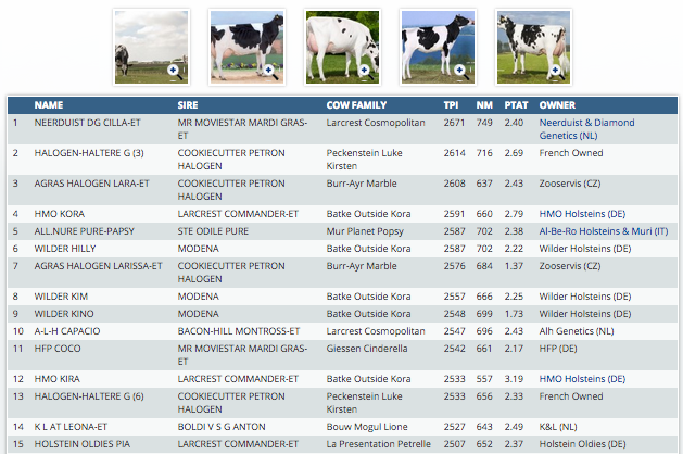 The American GTPI run of February 2015 took place yesterday, see here the complete Top 50 GTPI of the European females. The #1 this run is one of the highest new heifers in the World: Neerduist DG Cilla, born in the Netherlands. She is a dtr of Mardi Gras and goes back through an Epic and Planet on the fantastic Larcrest Cosmopolitan. She is owned by Neerduist Holsteins & Diamond Genetics. A great run for the Batke Outside Kora cow family, this fantastic show cow is the foundation cow behind 7 heifers in the February top list.