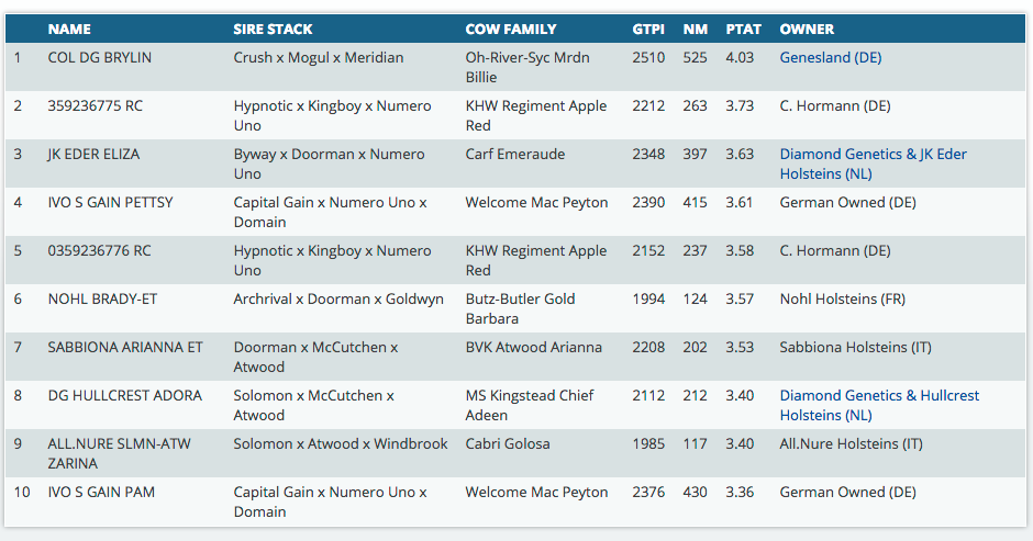 The highest new heifer in the European top type (PTAT) ranking is Col DG Brylin from Genesland, Germany. She has PTAT +4.03 (combined with >2500 GTPI). She and her full sister are the only 2 heifers in Europe >4 points PTAT, while another full brother is >4 points PTAT as well! With +20 Conformation (+22 DGV Conf.) Brylin is as well the #2 Conformation heifer on Canadian base in the breed! Brylin and Brylan are daughters of Maverick Crush which is not available in Europe, her dam is a Mogul, followed by the full sister to the type sensation Oh-River-Syc Byway from Semex, going back on the Barbie cow family. Click further for the complete European Top 10 PTAT of the intermediate May '17 run.
