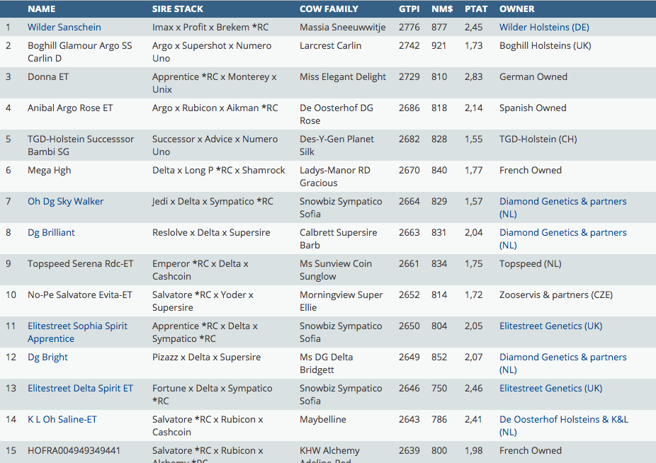 It's time for the latest European RED CARRIER ranking for females based on the GTPI index. NOTE: this is an un-official list, we tried to include all European Red Carriers which should be on this list. The #1 GTPI *RC is again Wilder Sanschein with +2776 GTPI. This Imax daughter stands +34 points above the second one in the list!! Furthermore we find Oh DG Sky Walker, a Jedi daughter with +2664 GTPI at place 7. She is a sister to the newest sensations Westcoast SOUNDCLOUD (+2773 GTPI) and Westcoast SWINGMAN-RED (+2691 GTPI). Also at EliteStreet genetics we find toppers from this family in the list.