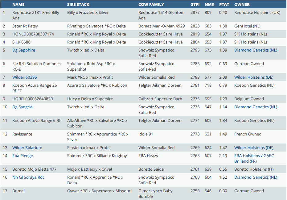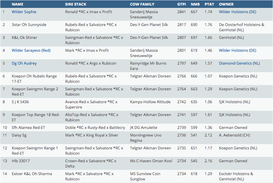Europe offers some of the highest Red and White and Red Carrier females in the Holstein breed based on GTPI base. The influance of several foundation cows are significant and dominating in the list, with for example Des-Y-Gen Planet Silk, De Oosterhof DG Rose *RC, Snowbiz Sympatico Sofia-Red, Wilder K25 Red, Sanderij Massia Sneeuwwitje and Cookiecutter Ssire Have. The #1 R&W GTPI female is for the third time in a row for Wilder Holsteins with Ronald *RC daughter Wilder Sophie-Red at +2841 GTPI. She is as well the #3 GTPI Ronald *RC daughter in the World and backed by the Sanderij Massia Sneeuwwitje *RC VG-89-NL family. Furthermore Diamond Genetics has with DG Saphhire *RC, a Twitch daughter from the Snowbiz Sympatico Sofia-Red family, the #5 RED CARRIER GTPI female in Europe this December 2020 run at +2795 GTPI.