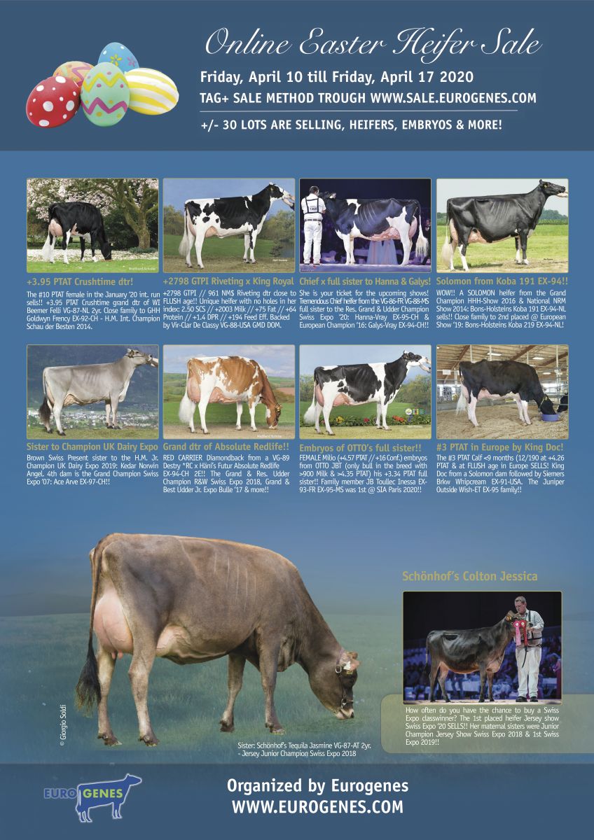 Only a few days and the Online Easter Heifer Sale will be launched. This sale will be held from Friday, 10 April till Friday, 17. April 9:00 p.m. (CEST). This ONLINE Easter sale offers the very best: SHOW heifers, INDEX heifers and many intersting embryo packages. With for example: a +2798 GTPI Riveting daughter close to flush age from the Vir-Clar De Classy VG-88-USA GMD DOM family, a tremendous Chief show heifer from the VG-86-FR VG-88-MS full sister to Hanna-Vray EX-95-CH & Galys-Vray EX-94-CH, Häni's Futur Absolute Redlife EX-94-CH - Grand Champion R&W Swiss Expo 2018 her grand dtr, a classwinner of the Jersey show Swiss Expo '20 & many more!!