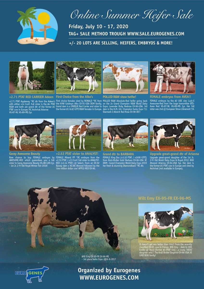 Only one day and the Online Summer Heifer Sale will be launched. This sale will be held from Friday 10. Juli till Friday 17. July 09:00 P.M. (Dutch Time). This ONLINE Summer heifer sale offers the very best for you: SHOW heifers, INDEX heifers and many intersting embryo packages. With for example a Tatoo daugther of the recently classified EX-95 cow in France and dam to Wilt Emilio: Wilt Emy, a R&W & POLLED first choice by Ronald *RC from the Aiko's, R&W POLLED show heifer from the Redrose family, TYPE from the Adeen's and multiple great embryo packages!!
