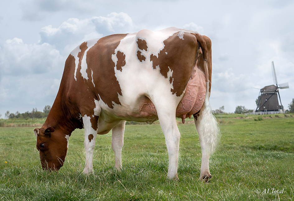 The stunning 4yr. old R DG Adelheid Red scored VG-87-NL in her 2nd lactation with EX-90 for her Mammary System! This amazing Andy-Red daughter is dam to Delta Endless *RC son, DG Adrion-Red at +221 gNVI in combination with +938kgM with +0.11%F and +0.09%P, +108 Type, +108 Feet&Legs and a very complete linear. R DG Adelheid VG-87-NL EX-90-MS La2. is straight out of R DG Alina Red VG-87-NL VG-87-MS (s. Emperor) out of R DG Adalyn VG-87-NL 2yr., the full sister to R DG Aladdin @ Cogent. This Entitle son of R DG Avira-Red VG-85-NL 2yr. (s. Olypmian *RC) goes back on the famous Detox *RC daughter: BTS Avea-Red. Avea her dam KHW-I Aixa Baxter has had a lot of influence in the R&W population and combined production and type together in one package!