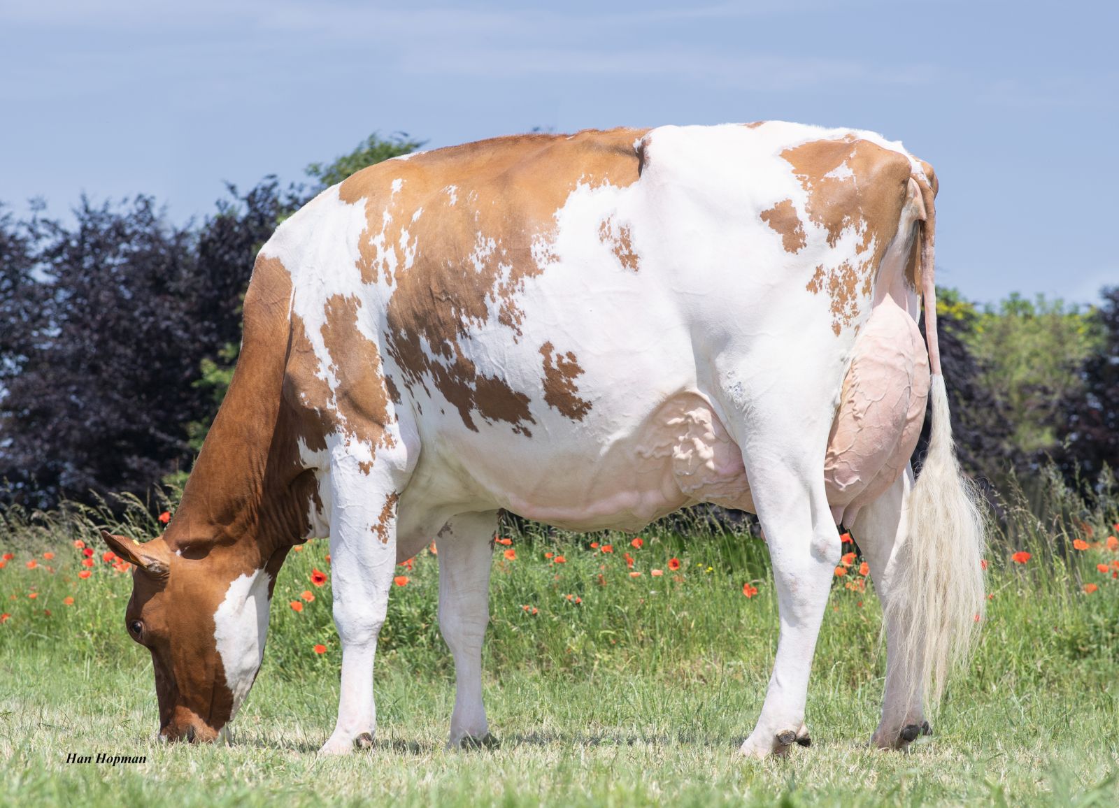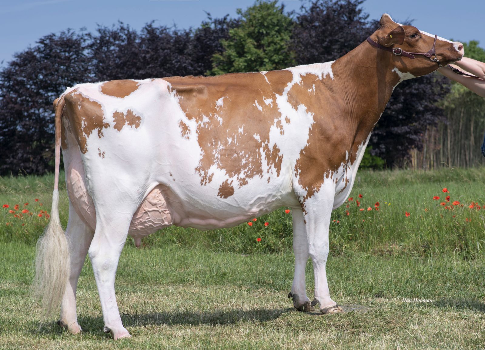She has earned the EXCELLENT predicate, the Red & White Apoll P daughter: JK Eder Rocca Roxinne 1!! This tremendous Roxy offspring scored EX-91 for her Feet & Legs, VG-89 for her Mammary System and Dairy Strength, EX-90 for frame which resulted in EX-90 as a 4-Yr Old cow in the Netherlands. She is fresh in her 3rd lactation projected with >12.000kgM and a truly PROTEIN machine with 3.79%P!! She is backed by 10 generations EXCELLENT dams, but the best part: she has FEMALE embryos for sale by Amaretto-Red and Mirand PP *RC. Either her showy Jordy-Red (Premier Sire World Dairy Expo 2019) has FEMALE ST-Gen DORAL-RED embryos for sale! Please send us a Personal Message or mail for more info.