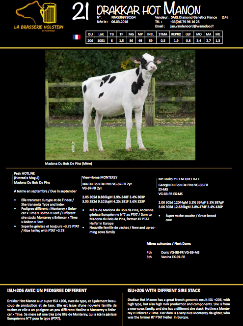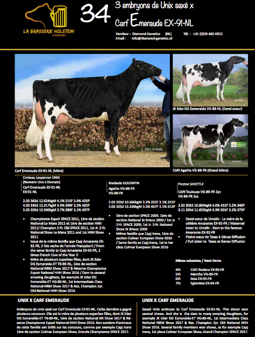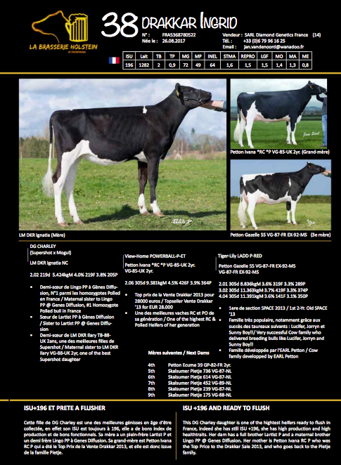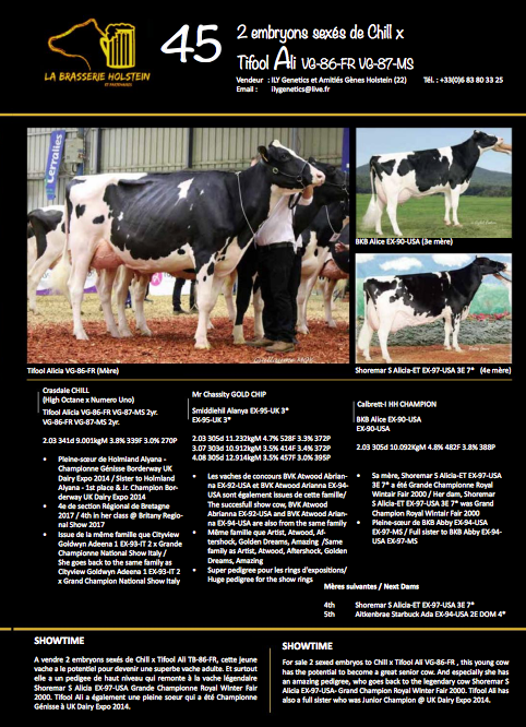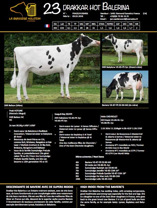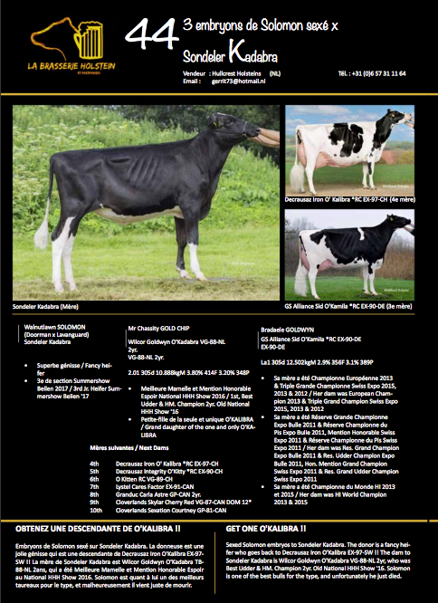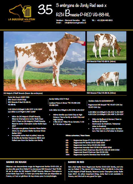 The Vente La Brasserie Sale will be held on Friday August 17th on the farm of GAEC Toullec in Plomelin, France! This sale is one you don’t want to miss! The best of the best Type, Show, R&W & heifers or milking cows, but all of them are big pedigreed animals who will sell during this event. Some examples are a Doorman granddaughter of the European Champion Descrausaz Iron O’Kalibra EX-97 or a Solomon daughter out of Blondin Goldwyn Subliminal EX-96-USA! For the Red and White lovers there is an Awesome-Red calf out of Ms D Apple Danielle Red EX-94-USA, she also has +2.71 PTAT, or 3 Jordy-Red daughter which all trace back to the great Apple! Also some 2yr. olds in milk are getting sold, one of them is JB Toullec Dreams Roxy, the Golden Dreams daughter out of the show winning Yorick daughter JB Toullec Yorick Roxy VG-88, which traces back to the queen of the breed, Glenridge Citation Roxy! Yorick Roxy her 9 milking daughters until now are all VG!