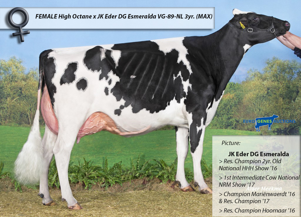 Some exciting embryo packages are selling in the Online Embryo Sale like: FEMALE High Octane embryos from the well-know Doorman daughter JK Eder DG Esmeralda VG-89-NL 3yr. (MAX). Esmeralda has many titles on her name: Udder Champion Noordeloos '18, Res. Champion 2yr. Old National HHH Show '16, 1st Intermediate Class National NRM Show '17 and more! She is straight out of Carf Emeraude EX-91-NL: the French National Champion as a 2yr. old.