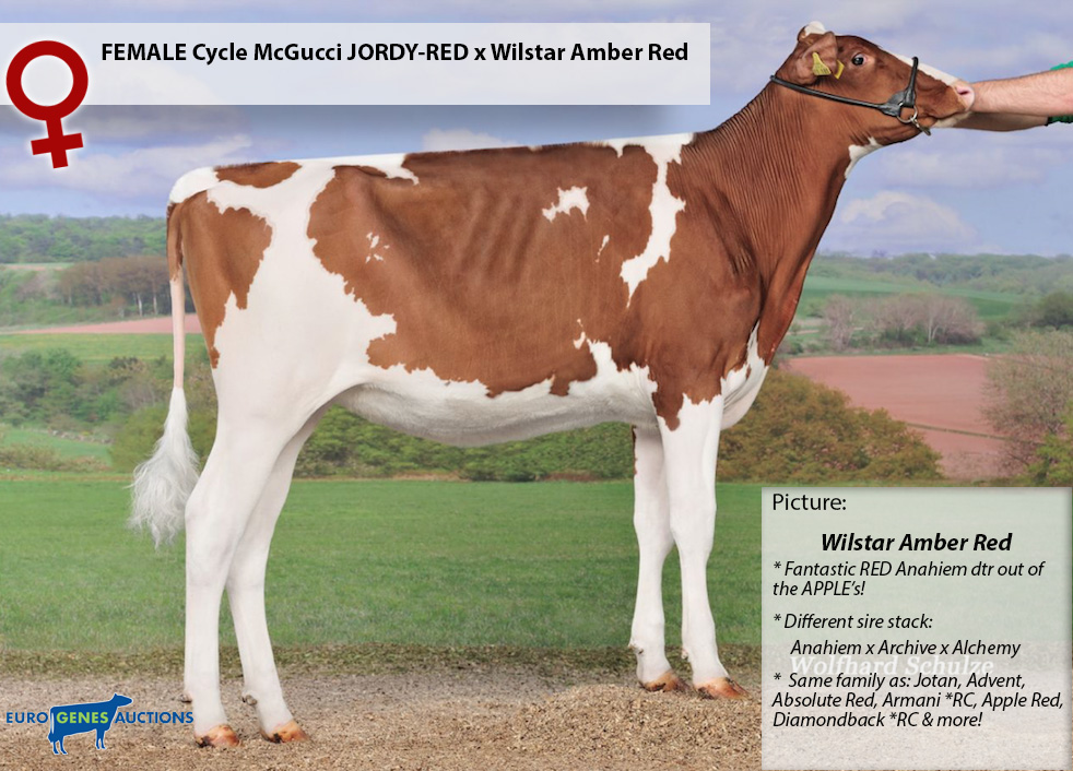 Cycle McGucci JORDY-RED FEMbryos (+3.62 PTAT) out of Wilstar Amber Red are offered in the Online Embryo Sale, which ends this Friday 9:00 P.M (Dutch time). Amber is a Anahiem offspring of the APPLE's with a different sire stack: Anahiem x VG-85-USA Archive x EX-90-USA Alchemy x VG-87-USA 2yr. Superstition x EX-90-USA Stormatic x KHW Regiment Apple-Red EX-96-USA.