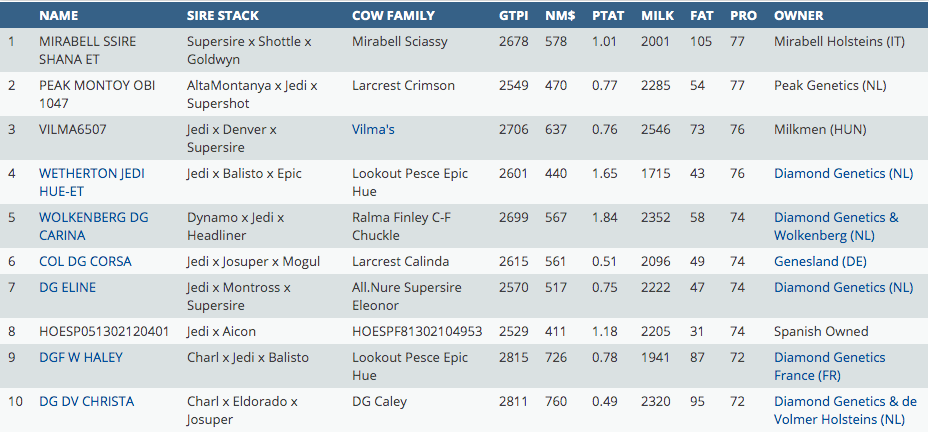 Today it's time for a great ranking on the trait PROTEIN based on the GTPI index!! We'll introduce you the top 10 PROTEIN females in Europe of the April 2020 proof! There are some little changes comparing this list to the foreign December 2019 proof. Jedi has again a lot of influence in the list with delivering again 8 (grand) daughters in the top 10. The #1 PROTEIN female in Europe is again Mirabell Supersire Shana at +77 lbs protein. Second is Peak Montoy Obi 1047 with either +77 lbs protein backed by Larcrest Crimson. At the thrid spot we find Vilma 6507, an Jedi daughter with +76 lbs protein. Her maternal sister by Humblenkind sold in the European Masters Sale '19 to Roccafarm Holsteins & T. Adams. New in the top 10 are Charl daughters DGF W Haley at +72 lbs Protein and DG DV Christa at either +72 lbs Protein.