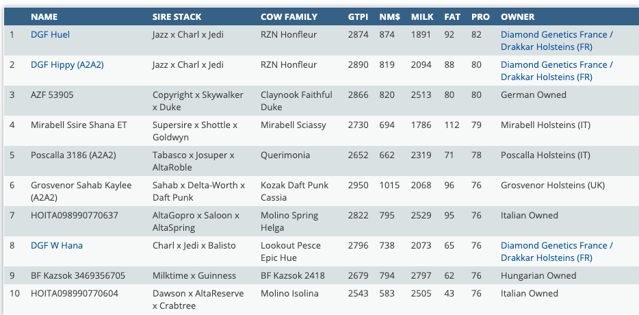 Today it's time for a great ranking on the trait PROTEIN based on the GTPI index!! We'll introduce you the top 10 PROTEIN females in Europe of the August 2021 proof! Jedi has again a lot of influence in the list with delivering again 3 (grand) daughters in the top 10. The #1 PROTEIN female in Europe is again DGF Huel (s. Jazz) at +82 lbs protein. In second follows either DGF Hippy (A2A2) with +80 lbs protein backed by Lookout Pesce Epic Hue. At the shared second spot we find a Copyright daughter from Germany with either +80 lbs protein. At the sixth spot we find the dam to the #1 and #2 PROTEIN females in Europe: DGF W Hana at +76 lbs protein.
