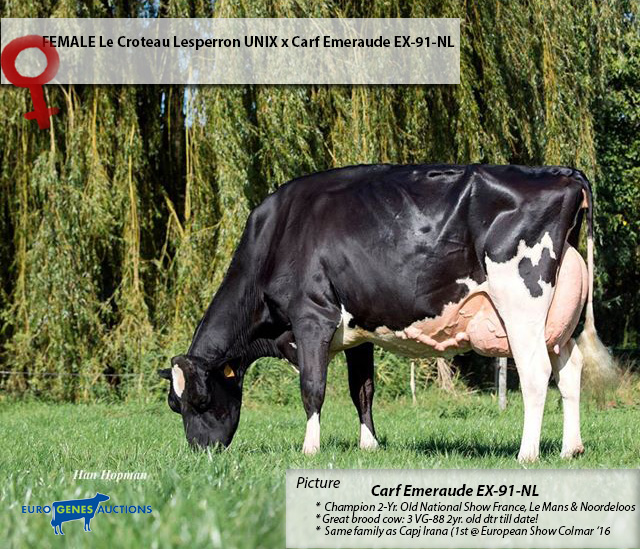 Carf Emeraude made some exciting Le Croteau Lesperron UNIX FEMbryos which are sellling in the Online Embryo Sale. This fantastic brood-cow has 3 VG-88 2yr. olds till date and won multiple shows in France and the Netherlands. She goes back on Amarante, which was 2x French Cow of the Year. Emeraude her Doorman daughter was Res. 2-Yr. Old Champion at the National HHH-Show.