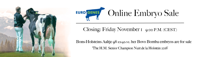 The Eurogenes Online Embryo Sale has almost come to her end!! This sale includes very UNIQUE & EXCLUSIVE offers, with for example: Bovo BOMBA (#1 Conf. bull in Canada / +19 Conf. / NOT available anymore!!) from the H.M. Senior Champion Nuit de la Holstein '18: Bons-Holsteins Aaltje 98 EX-92-NL EX-93-MS, FEMALE JERSEY embryos from the 2-Yr Old Champion German Dairy Show '19: Victoria Secret VG-85-DE 2yr., the very first FEMALE Aristocrat embryos from the top NET MERIT cow: Bodile VG-85-DE 2yr., SIDEKICK by the Grand Champion National HHH-Show '14 & '15: Marie 356 EX-92-NL, R&W and many herdbuilding embryo packages starting at only 75 EUR / embryo!! Don't miss these amazing chances, the sale closes TONIGHT (9:00 p.m.)!!