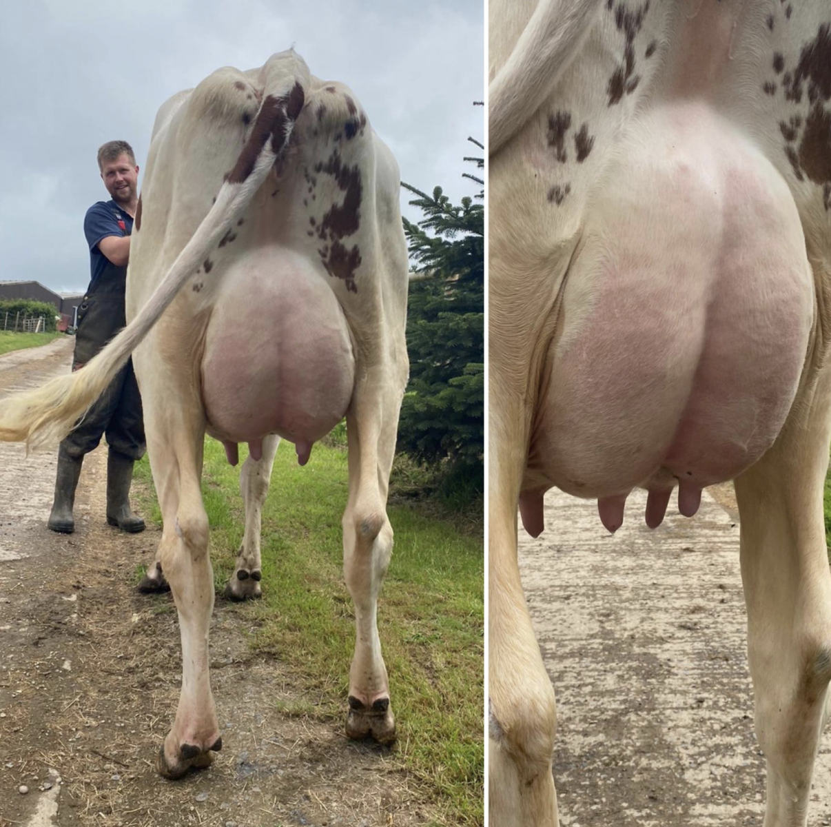 The first daughters of R DG Aladdin are fresh in the UK. Hereby a few snapshots of Hayvalley Aladdin Rae Red which calved very young at 1 year and 8 months and scored already VG-86-UK at 1 year and 9 months, producing 35,8 kg milk / day already! She was a prolific show winner last year winning 7 1st places as a heifer! Aladdin bred by Rijnhof Holsteins and Diamond Genetics, he is a son of Entitle from R DG Avira Red (s. Olympian), followed by the tremendous show- & brood cow BTS Avea Red VG-87-NL VG-89-MS from the Aiko cow family.