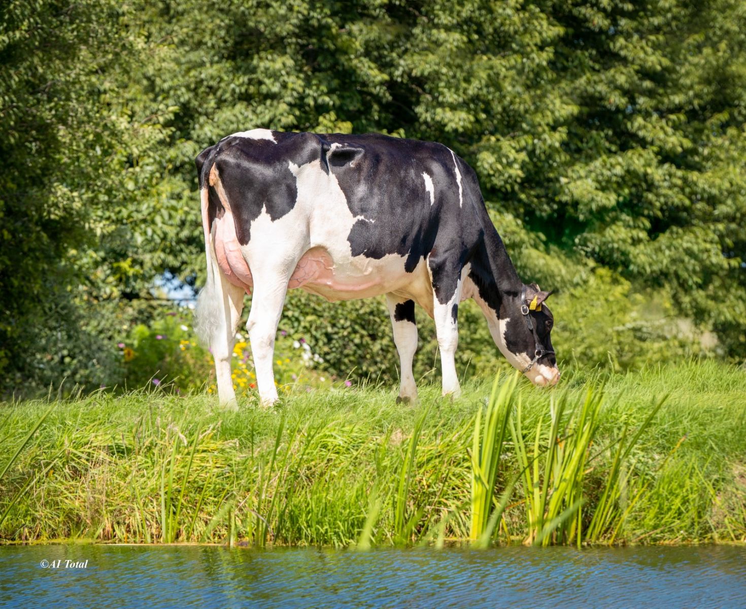 DG Dr. No delivers what he promised! The first daughters of DG Dr. No are fresh in the Netherlands and are looking promising! Recently we received a picture of a fresh Dr. No daughter in the Netherlands. DG Dr. No @ AI-Total is sired by Genosource Captain from the EX-90 Crimson daughter, Gen Durkje EX-90-NL from the Al-Lew Monterey Ashley EX-95-USA family, has a complete GTPI index and is one of the highest B&W Genomic gNVI sires in the Netherlands at +329 gNVI! He guarantees in his US-index +3173 GTPI with +1414kgM / +0.07%F / +0.01%P / +870 NM$ / 2.79 SCS / -0.46 Stature.