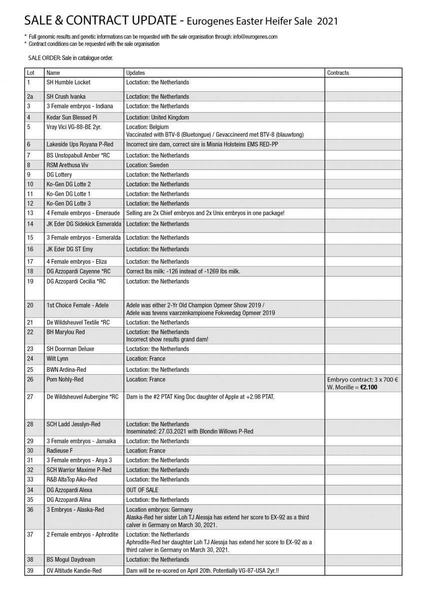 The first SALE UPDATE of the Eurogenes EASTER Heifer Sale 2021 is now ONLINE available for you. This SALE UPDATE includes also contracts on the lots selling in the Easter Heifer Sale. The auction will start this Friday evening at 7:00 P.M. (Dutch-time) and can be attended through the SALE SITE. More info can be requested through the sale organisation. Click further to view the sale update.
