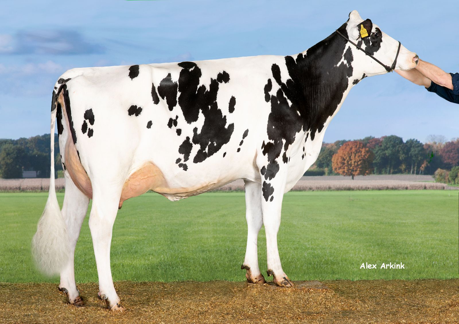 The very first daughters of Veelhorst DG CASINO @ VOST are fresh in Germany! Either one of them is pictures: Cassia. She calved at 23 months and is producing 37,9kgM / day in average with 4.0% fat and 3.2% protein. Casino was the former #1 RZG bull in the breed, has a Bookem-free pedigree, sired by DG Charley from a Mardi Gras x Planet x Snowman (Broeks Betty), he has a huge production index (DE +1857 Milk / positive components / RZM 146), >115 RZE, high fitness traits, milkability (RZD 105) and an excellent udder health (RZS 118). His daughter Madeira sold for 19.000 EUR through the Sunsire-Sale. Casino is available in Germany through the VOST and is international available through GGI.