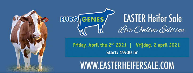 Just take a break to watch the very first videos of the lots selling the Eurogenes Easter Heifer Sale 2021. Friday evening, April 2nd, at 19:00 (Dutch-time) the sale can be attended LIVE ONLINE through WWW.EASTERHEIFERSALE.COM. You need to register a new account for yourself to attent the auction and to be able to place bids on the great lots selling. Selling are incredible heifers, embryo packages, Jersey's, Brown Swiss' and fresh cows from WORLD CLASS families and outstanding type & index figures. Click further for the first videos.