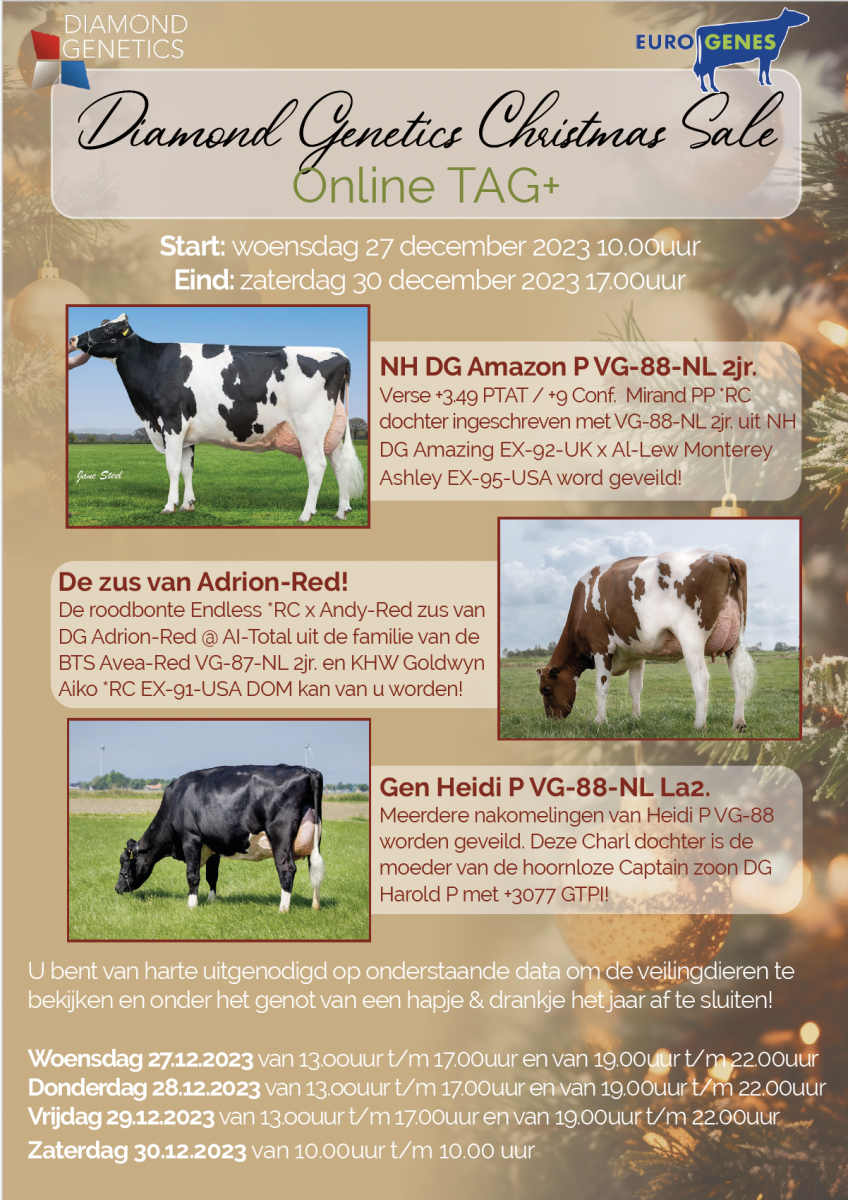 COUNTDOWN! Nog een aantal weken voordat de Diamond Genetics Christmas Sale - Online Tag+ plaatsvindt! De veiling start ONLINE op woensdag 27 december 2023 om 10.00uur en sluit op zaterdag 30 december 2023 om 17.00uur (Nederlandse tijd). Er worden meerdere interessante dieren verkocht, waaronder NH DG Amazon P VG-88-NL VG-87 Uier 2jr., een +3.49 PTAT / +9 Conf. HOORNLOZE Mirand PP *RC dochter uit NH DG Amazon P EX-92-UK uit Al-Lew Monterey Ashley EX-95-USA, een hoornloze en roodfactor Bellroy dochter en zus van Hul-Stein Mozart PP *RC: Hul-stein Holly Pp *RC VG-87-NL VG-86 Uier 2jr., de VG-86-NL La2. moeder van de super scorende roodbonte gNVI stier: DV DG Rammstein-Red en nog vele interessante dieren meer!