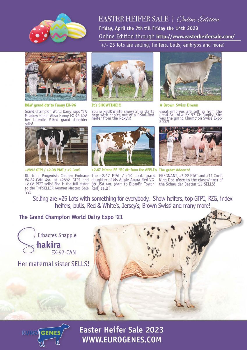 The countdown to an exciting sale in Europe has been started, the Online edition of the Eurogenes EASTER Heifer Sale 2023. The Eurogenes EASTER Heifer Sale will be held ONLINE on Friday the 7th of April till Friday the 14th of April through the sale site. Videos and snapshots of the lots selling will be available in the week before the sale. Selling are >25 lots with something for everybody. High genomics, fantastic show heifers, Brown Swiss's, Jersey's, Red & White's, embryo packages and much more.