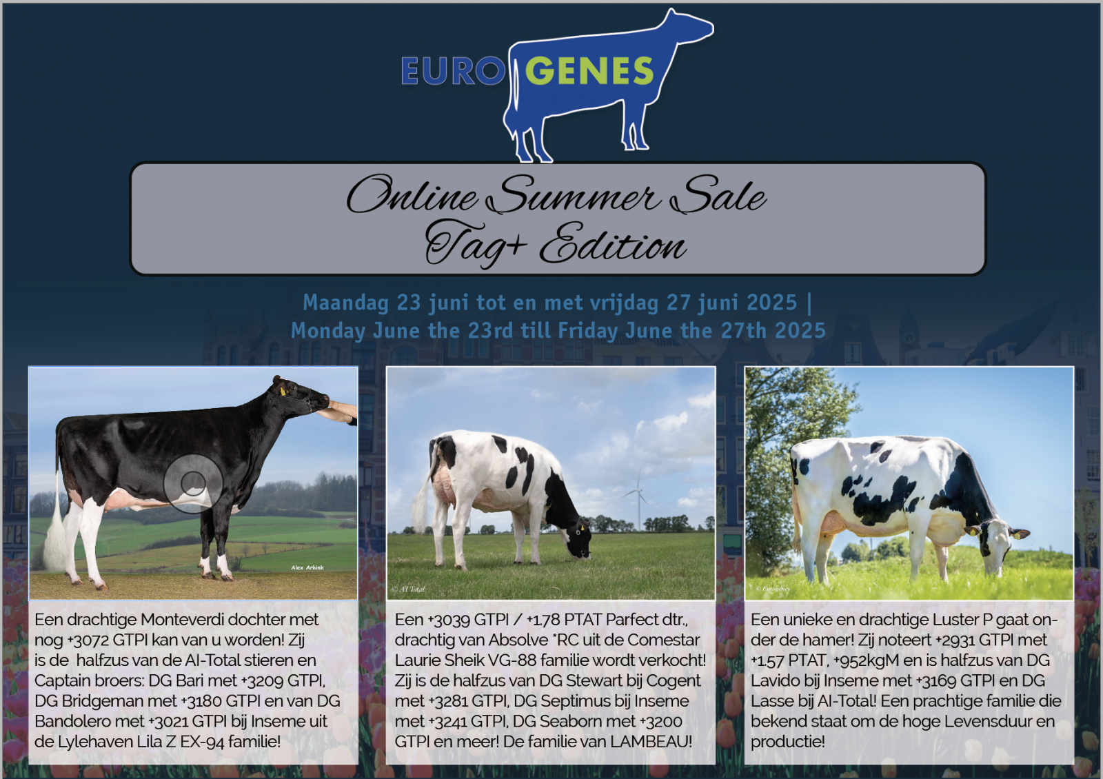 Only a few weeks left before the Eurogenes Summer Sale - Online Tag+ is taking place! The sale starts monday June the 23th and ends at friday June the 27th, 2025! Many interesting heifers are selling this sale with for example a pregnant Endless *RC sister to one of the highest gNVI sires in the Netherlands: DG Omega @ AI-Total or a pregnant Parfect daughter at +3063 GTPI / +1.32 PTAT, sister to DG Cheko @ AI-Total and tracing back to the Larcrest Cosmopolitan VG-87-USA family. Consign your best heifer now for this interesting upcoming sale!