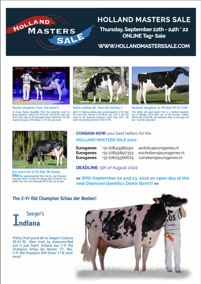 The flyer of the Holland Masters Sale 'Online TAG+ Sale' is available! This sale will be held on September the 22th till September the 24th, 2022 as an ONLINE TAG+ SALE. We can show you the very first great consignments but are still looking for heifers and calves to sell in this special edition. You can consign your heifer now for this auction till August 5th through the contact persons mentioned in the flyer.