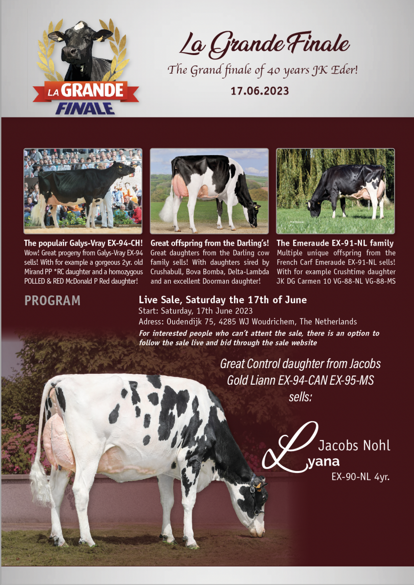 On June the 17th, 2023 is a great livestock sale in Europe! It's unique, special and one time: The Final Sale of 40 years JK Eder breeding. Forty years of breeding at the highest level - for conformation, index, production pedigree, total index... COMPLETE! From Delta Eugenie, JK Eder Nueva, Goldchip Darling to Carf Emeraude – named Dutch Cow of the Year 2022! A special day for the Kolff family and at the same time a special opportunity for buyers all over the WORLD!! The auction is organized by JK Eder and Diamond Genetics and will taking place on Saturday June the 17th, 2023 in Woudrichem at the Kolff family farm. Selling are >110 lots with something for everybody, high genomics, fantastic show heifers, fresh cows and embryo packages.