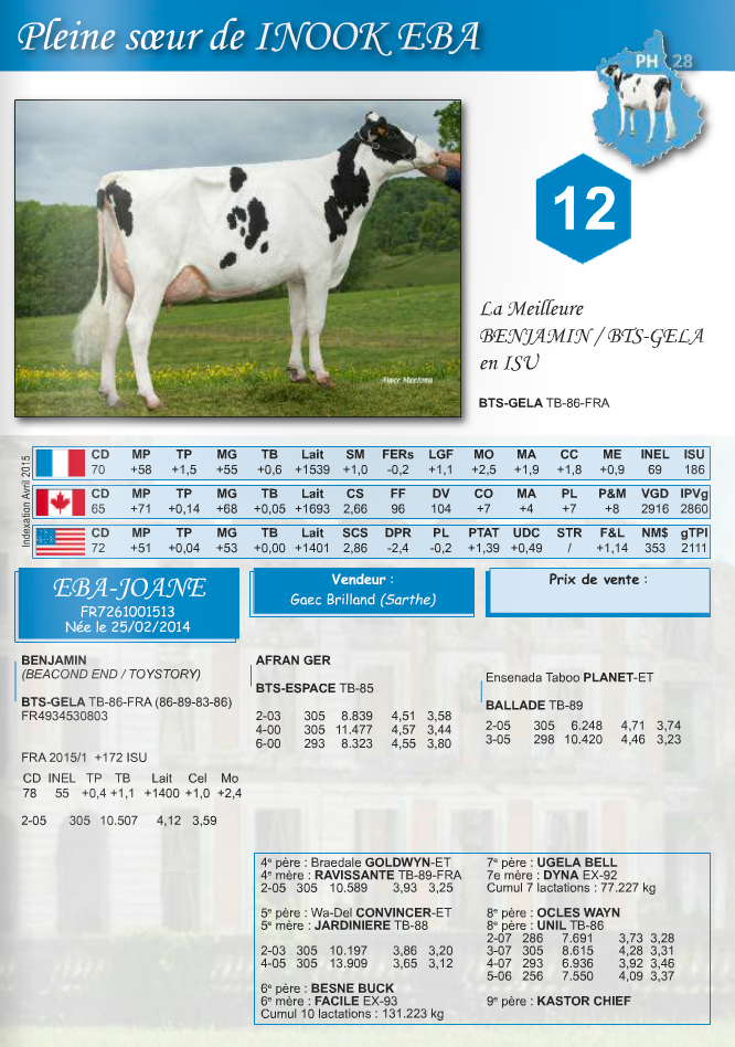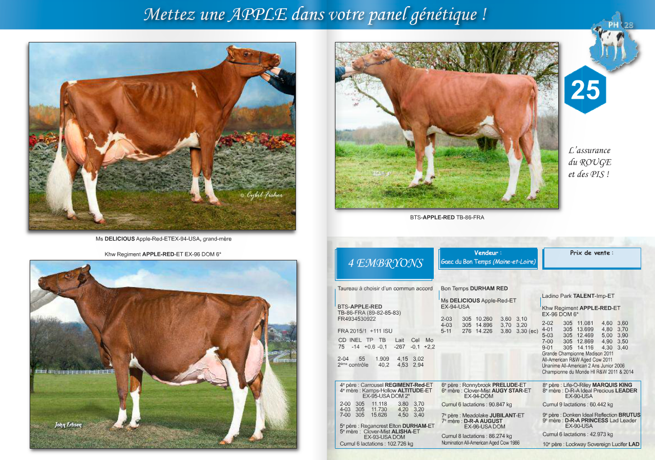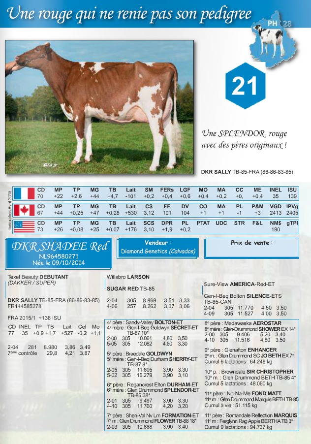 The Vente Orne 2015 will be held on Wednesday the 27th of May. Several Eurogenes members from France will offer their best genetics in this sale like a +187 ISU Diamond daughter going back on the Royal- & Madison Grand Champion RF Goldwyn Hailey EX-97, a >2200 GTPI Jerod dtr from Coyne-Farms Ravish Jody, a red Debutant dtr from DKR Sally of the Splendor cow family and more!