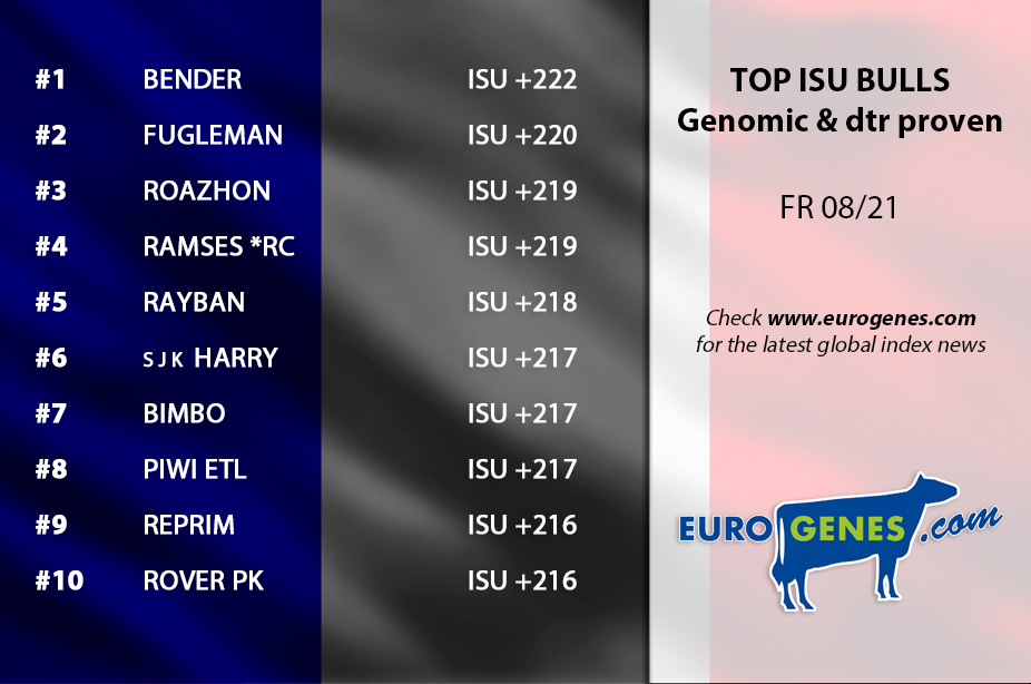 A great proof in France for Bali son BENDER, he remains at the top at +222 ISU. In second follows FUGLEMAN at +220 ISU and the stage is complete by ROAZHON & RAMSES *RC both at the third place at +219 ISU. The 6th ISU bull in France is S J K HARRY @ AI-Total, he guarantees for +217 ISU and is a Nacash son Primeval Genetics 1372 VG-86-USA (s. Blowtorch) going back on Cookiecutter MOM Halo VG-88-USA DOM. Also a solide proof for Gen GOODLIFE, he still guarantees for +212 ISU. Click further for the complete French rankings.