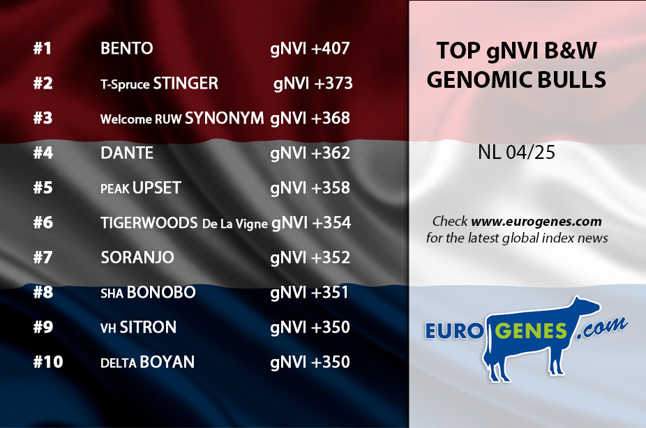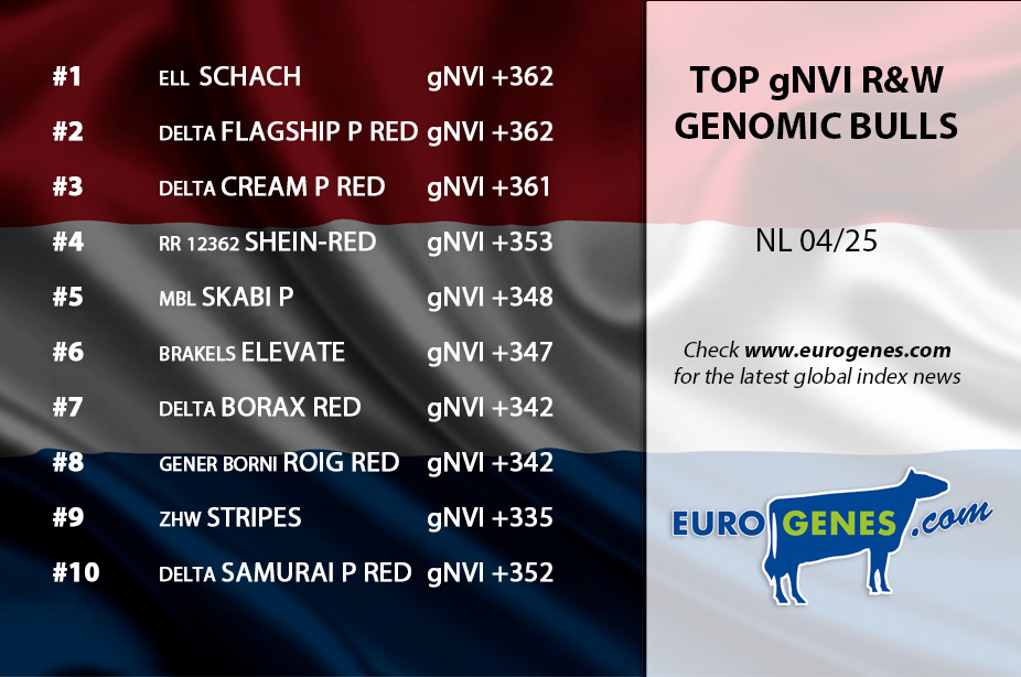 The Charl son and daughter proven sire Genosource Captain is still the charttopper in the Dutch gNVI rankings at +327 gNVI. He has 52 daughters in his Dutch index and guarantees +2144kgM with +0.32%F and -0.02%P. In second follows Wet Acura Maximus at +309 gNVI and 216 daughters in his index. Making the top 3 complete with Delta Reloader at +296 gNVI. Charttopper in the B&W gNVI Genomic ranking is Bench son Bento at +407 gNVI with a lot of milk: +2115kgM and +0.08%F and -0.05%P. At the second spot we find an early Metcalf son: T-Spruce Stinger at +373 gNVI and at the third spot we find a Soysauce son at +368 gNVI. A shared first spot with R&W gNVI genomic sires for Ell Schach and Delta Flagship P Red at +362 gNVI. They are followed by Delta Cream P Red at +361 gNVI.