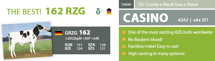 Germany are the first today with the new bull publications. The RZG formula has been changed with more emphasize on fat production and with the addition of the females in the reference population. The big winner of the new formula are the sons of DG Charley who has now no less than 6 sons in the German RZG Top 15 with on the 1st place Siemers Merryguy. The entire Top 3 RZG bulls in Germany are Siemers Merryguy, Hul-Stein Crownmax and Riethil Summerlake and has all been delivered through Diamond Genetics. Some of the big winners this run are CASINO from Vost at RZG 162, NEAL from AI Total with RZG 162 and DG Eagle with RZG 160! Harper is the current #1 dtr proven RZG bull with RZG 159, followed by Dante, Balisto and Mayflower.