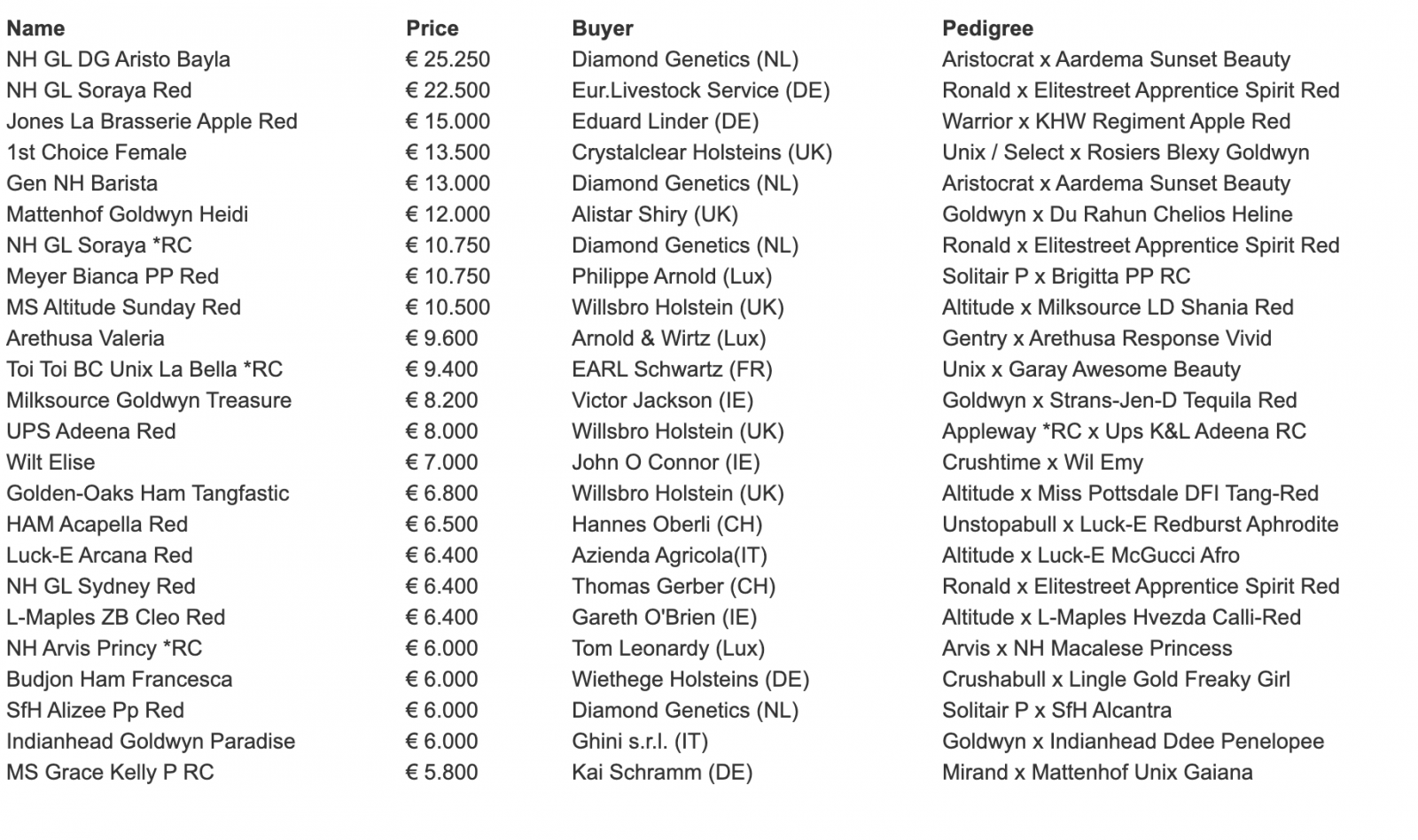 A clearance rate of >90% of the lots sold for an average price of € 5.625 on the live lots and 59 embryos sold with prices up to € 1.000 per embryo. Lots sold to buyers from 12 different countries.