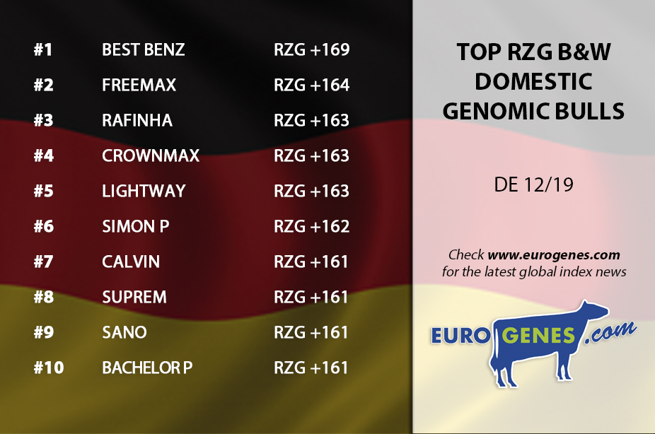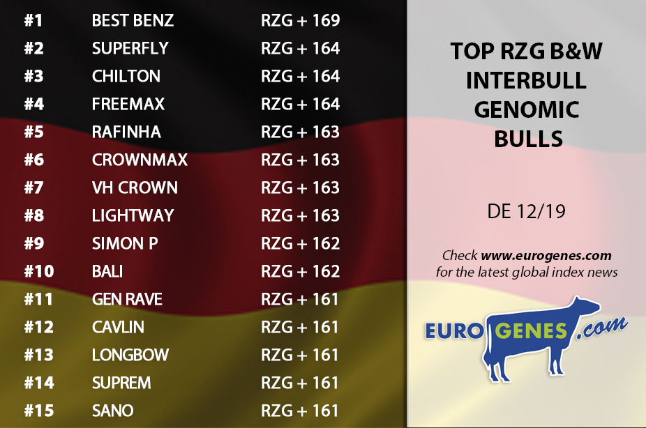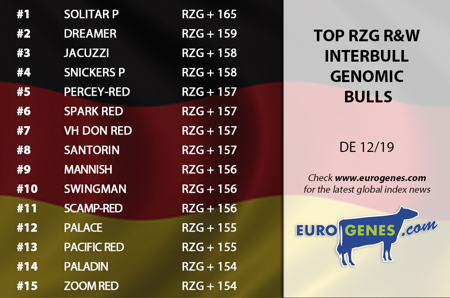 We starts today index run with the NEW bull indexes from Germany based on RZG. The new RZG leader in the B&W interbull genomic list is Best Benz, a Benz son who notes +169 RZG far away from the second one in the list: Superfly with +164 RZG. Also Hul-Stein CROWNMAX has a great run with +163 RZG at place 6. New in the list is Gen Rave, a Rio son from Col Orlanda tracing back to Hickorymae Manoman Opine-P EX-90-USA, with +161 RZG at place 11. The #1 daughter proven RZG bull in the B&W interbull list is Rubicon with 5.862 daughters noting +156 RZG. The outstanding leader in the R&W Genomic interbull list is Solitair P increasing his RZG index with 5 points to +165 RZG. He is followed by Dreamer at place 2 with +159 RZG. This December 2019 has also been a great run for Col DG Spark-Red he adds one point to his score to +157 RZG at place 6.