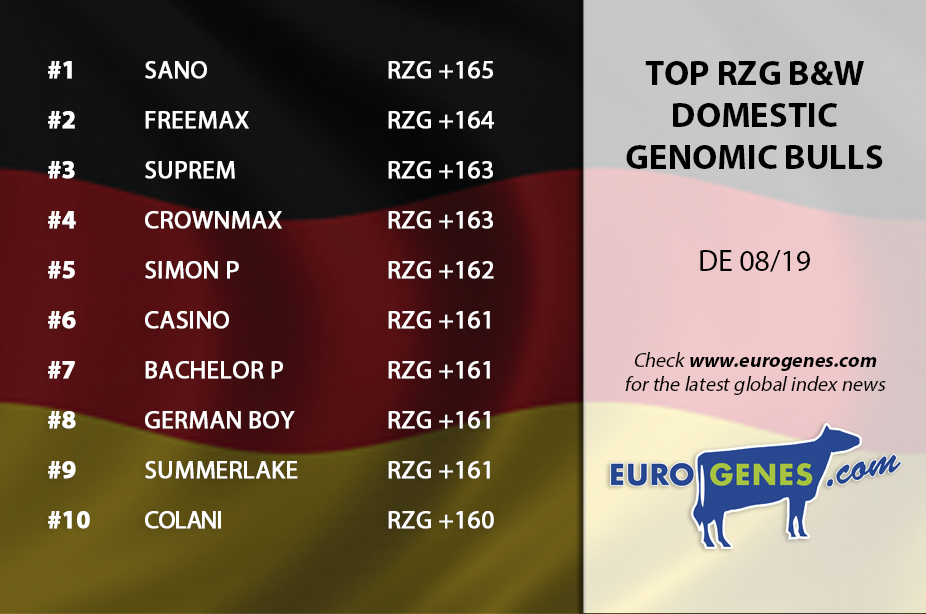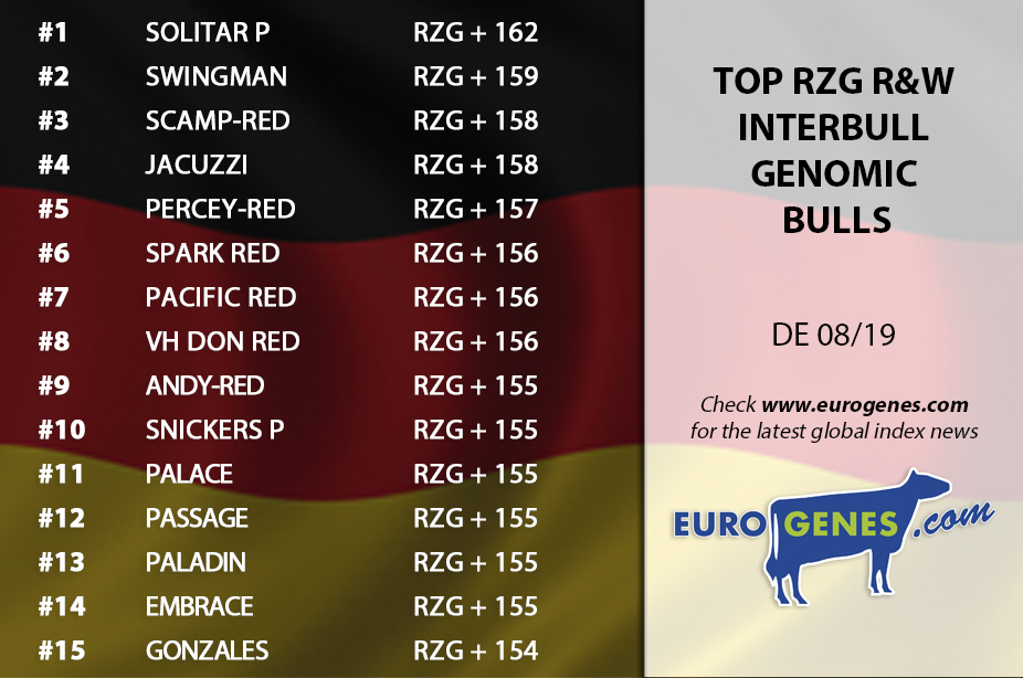 Germany is the first today with the newest bull publications. The new #1 RZG bull in the genomic interbull list is SANO, a Sonic son with +165 RZG. His dam Rhala EX DG Jacy is sold through the German Masters Sale 2016 and bred by Diamond Genetics & Rhala. Chilton rises to place 2 in the list with still +164 RZG. CROWNMAX keeps impressing with +163 RZG at place 6. This Imax son impresses with >1600 Milk & +156 RZM and is bred by Hul-Stein. In the top 15 RZG bulls is DG Charley again leaving his mark with delivering 4 sons!! In the top RZG R&W list is Solitair P still leading the Interbull Genomic list with +162 RZG. Second in this list is the heavily used Wescoast Swingman with +159 RZG. Col DG Spark-Red is also again topping in this list with +156 at place 6. The Anreli son Andy-Red notes +155 RZG at place 9.