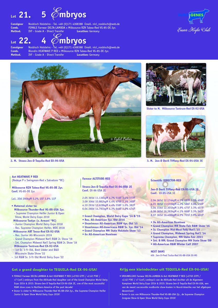 Only one day left before the Easter Heifer Sale 2023 comes to an end. The sale closes on Friday April the 14th 2023 at 09.00 p.m. (Dutch Time). Many interesting lots are selling with for example Lot 21 and Lot 22. It's an amazing chance to get a grand daughter to Strans-Jen-D Tequila-Red EX-96-USA, the Director-Red daughter and Grand Champion World Dairy Expo 2014 & 2015, Res. all-American 5yr. old 2016 and more. Out of her VG-85-DE 2yr. old Altitude-Red daughter, Milksource RZN Tabea-Red are Female Delta-Lambda (+2801 GTPI / +2.66 PTAT) embryos and Aot Heatwave P Red (+2.72 PTAT / +2787 GTPI / +7 Conf.) embryos selling! Tabea-Red VG-85 2yr. is maternal sister to Milksource Thunder-Red VG-88-USA 2yr., the Supreme Champion Heifer Jr. Show & Open Show World Dairy Expo 2019, Milksource ABT Tessa-Red EX-92-USA, the Res. Junior All-Wisconsin 2019, Grand Champion Midwest Nat'l R&W Jr. Show 2019 and to Milksource Tantrum-Red EX-92-USA, the classwinner Sr. 3yr. old, Best Udder and B&O Wisconsin State Show '22 and 1st R&W Sr. 3yr. old World Dairy Expo 2022!