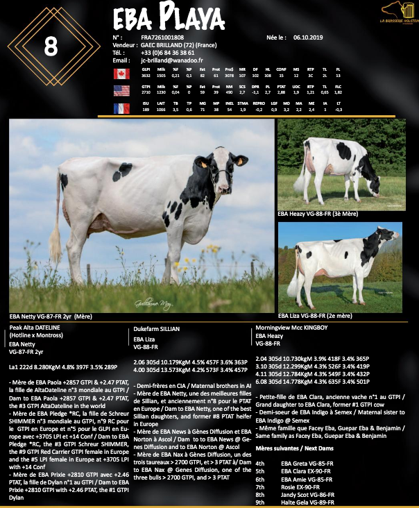 The GLOBAL superstar, huge brood cow and top index cow EBA Netty is FRESH with her first calf @ GAEC Brilland / EBA Holsteins, France!! She scored the huge score of VG-87-FR 2yr. and averages 37,3kgM / day after 222 days in lactation!! Her AltaDateline daughter EBA Playa is one of the very few heifers in the breed with >3600 LPI and >15 Conf. As well she guarantees for +2710 GTPI & +2.88 PTAT with either the beta-casein A2A2. What her makes more unique is that she is the #1 PTAT and either #1 Conformation AltaDatline daughter in the WORLD. She sells as lot 8 in the Vente La Brasserie Holstein August 21. This outstanding transmitting French cow family also delivered EBA Norton (s. Hotline) (+2714 GTPI // +2.58 PTAT) @ Ascol and EBA News (+2.65 PTAT) @ Genes Diffusion and maintains 9 generations VG- or EXCELLENT dams.