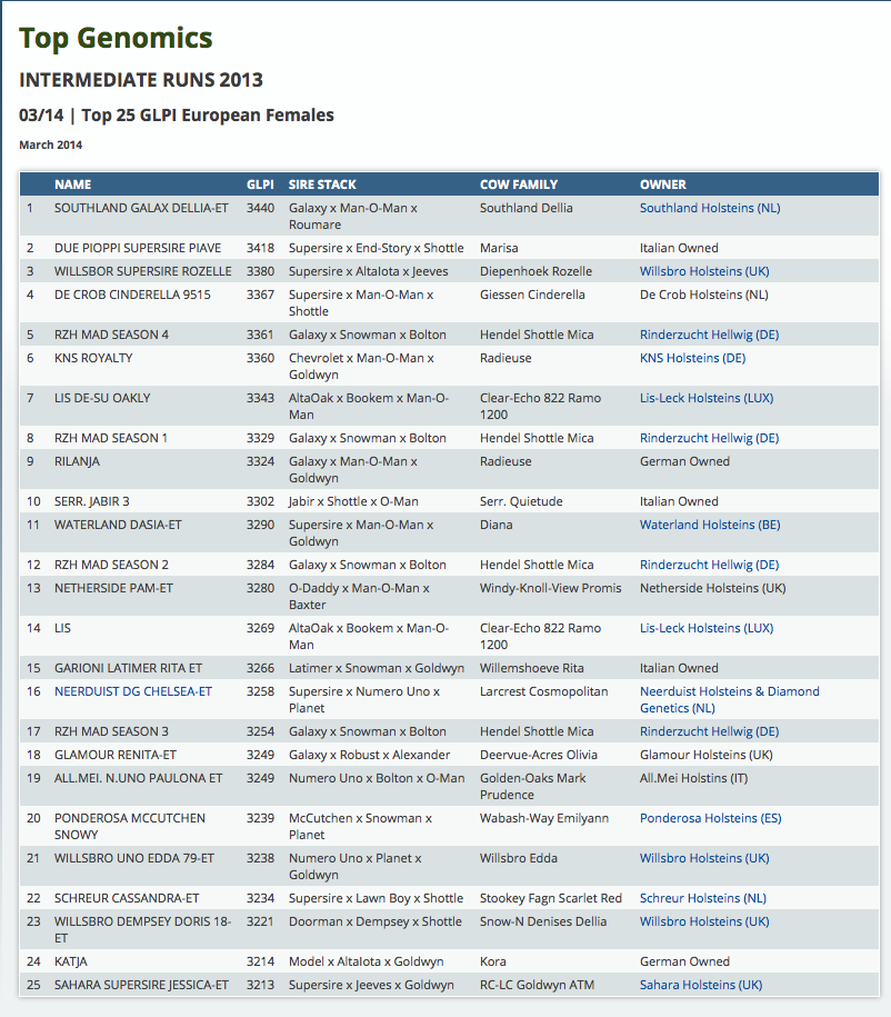 The top 25 GLPI European females from March 2014 are online! Southland Holsteins from the Netherlands is leading the GLPI European female list of March 2014 with an +3440 GLPI Galaxy daughter, Southland Galaxy Dellia. She is also the #1 GLPI Galaxy dtr World Wid and goes back through a Man-O-Man and Roumare dtr on the Southland Dellia cow family. Click further for the complete top 25 GLPI European females of March 2014!