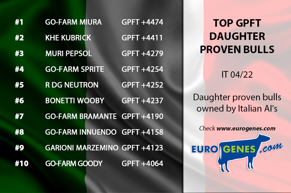The new indexes from Italy just came in! Topping in the daughter proven domestic PFT list is for the fourth time in a row Go-Farm Miura at +4474 PFT. On the second spot follows KHE Kubrick at +4411 PFT. On the fifth spot we find DG Charley son: R DG Neutron at +4252 PFT. Furthermore in the Top 20 we find DG Nebula, a Charley son with +4011 PFT. Leading the genomic domestic sire list is for Konrad son Palassoto Inseme Avon at +4867 PFT, in second follows Go-Farm Beerbum at +4808 PFT.
