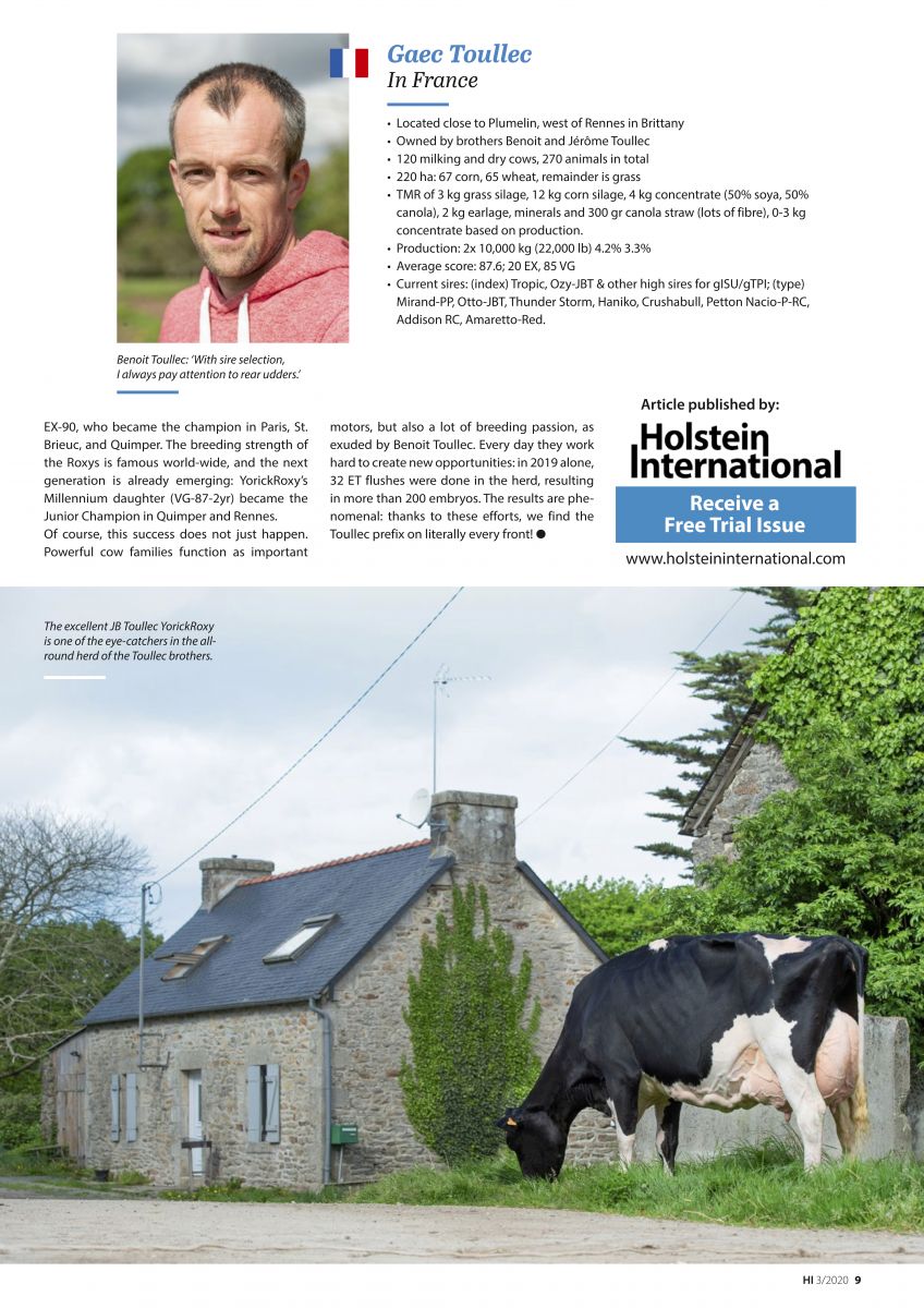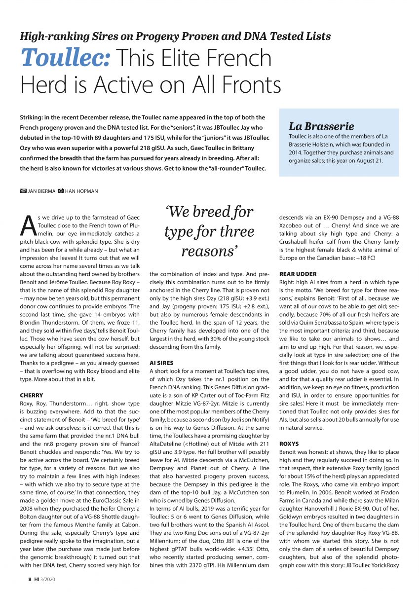 In the March edition of the monthly breeders magazine Holstein International is a very interesting & great article written about GAEC Toullec. JB Toullec Yorick Roxy is one of the great show cows at Toullec from this family also comes the bull OTTO JBT @ ASCOL. He is the only bull in the breed with >4.35 PTAT and >900 Milk! GAEC Toullec is one of the members of La Brasserie Holstein which has been founded in 2014. This year at August 21 they will organize a great sale together in Plomelin, France.