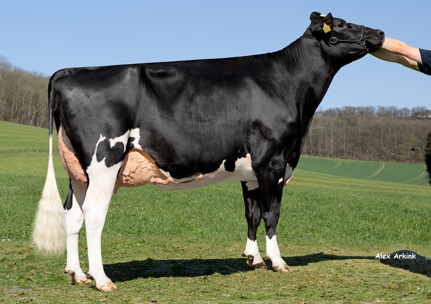 HET Cherise, bred by Hurkmans ET and topseller of the 31. Highlight Sale 2022, where she was sold for 67.000 EUR to the RUW (DE), developed into a great brood- and milkproductioncow! The early Kax Gladius daughter is the former Nr. 1 RZG and former Nr. 3 gNVI heifer is dam to the Nr. 8 B&W RZG Genomic sire: RUW Gin Topchamp (s. Champion) at +162 RZG @ RUW! She is classified with VG-85-DE as 2yr. old with VG-86 for her Mammary System and is projected in 305 days at 16.115kgM with 4.7% Fat and 3.8% Protein. HET Cherise is a daughter of HET Ken Cheryenne VG-86-NL 2yr. (s. Kenobi) followed by HET Sound Chenile VG-86-NL VG-88-MS 2yr. and goes back to Roccafarm Beacon Chrissy VG-87-NL 2yr. to Larcrest Oside Champagne EX-90-USA GMD DOM. The same family as O-Cosmopolitan, Cancun, Chevrolet, Fanatic and more.