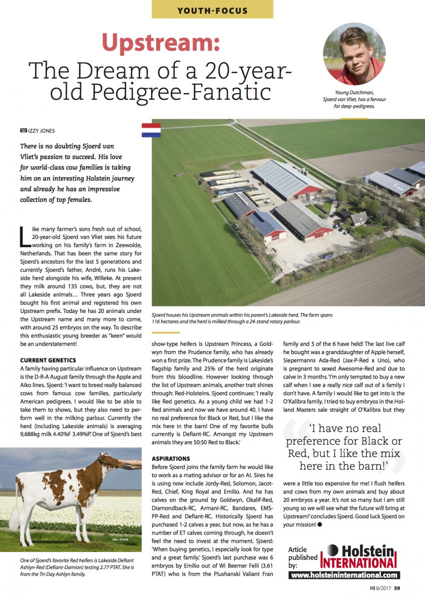 Recently Holstein International published an interesting article about the young and fanatic breeder Sjoerd van Vliet of Upstream Holsteins in the Netherlands. Sjoerd has a lot of passion for balanced show cows and has already an impressive collection of heifers. A family that had a lot of influence at Upstream Holsteins is the D-R-A August cow family through the Apple- and Aiko lines. You can read the full article below.
