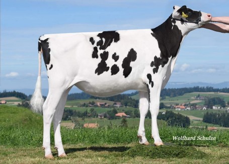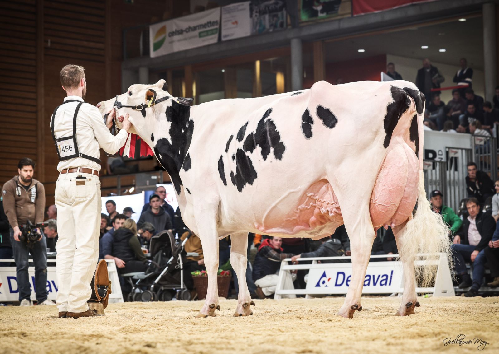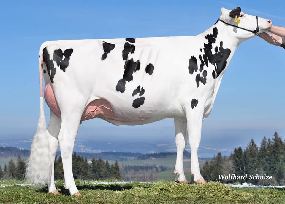 Sunibelle Dempsey Esprit leaves quite an impression last March. She was just 13 days fresh at the Expo Bulle 2023 and was in great shape! At the Expo Bulle 2023 she became 1st in her class with oldest B&W cows and was crowned as Honorable Mention Champion B&W. Esprit won multiple titles more, like: Reserve Grand Champion Expo Bulle 2019, Reserve European Grand Champion 2019 and Udder Champion Expo Bulle 2018 & 2019. Esprit is straight out of five generations VG/EX dams! Her deep pedigree: Phinicas Sanchez Esperanta EX-91-CH EX-94-MS 4E x Phinicas Baxter Niagara EX-92-CH EX-92-MS 3E x Phinicas September Elegante EX-91-CH 4E. Last month saw the classifier the 9 Years Old Esprit again and raised her score to EX-96-CH with EX-96 for her Mammary System! She is co-owned with Känel, Sudan, Jones, Conroy, Agriber & Serrabassa.