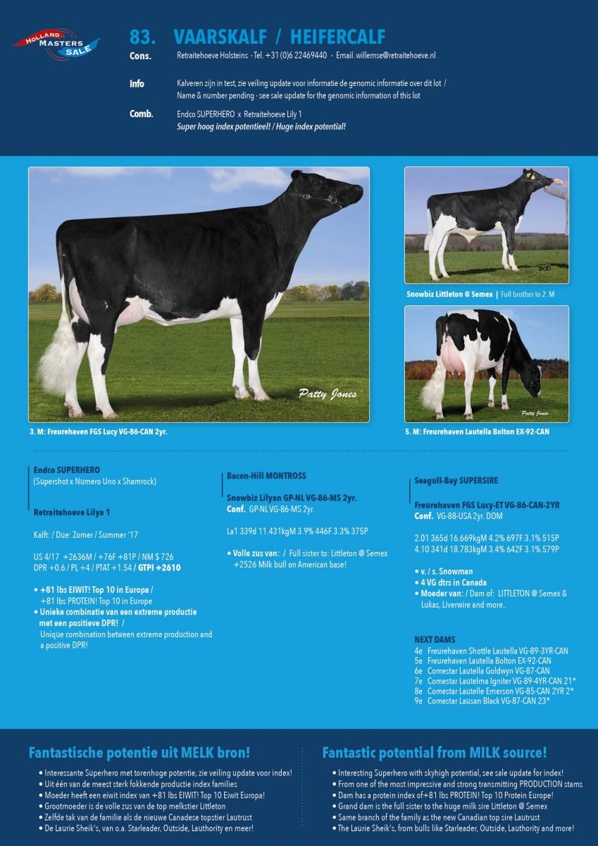 Lot 83 in the Holland Masters Sale is a 1st Choice female out of 2 live heifer calves, the genomics of these heifers came back and both rank in the European Top 5 GTPI of Superhero daughters, the buyer can choose out of Retratiehoeve Lilya 2 & Lilya 3 wihich are having GTPI +2747 and GTPI +2744 from which Lily 2 is the #2 Net Merit Superhero daughter in Europe with NM $ 896! They are full sisters from the Top 10 lbs Protein heifer in Europe Lilya 1, a Montross daughter from Snowbiz Lilyan which is the full sister to Snowbiz Littleton @ Semex, one of the highest milk sires in the breed (+2526M) going back on the extraordinary brood cow Comestar Laurie Sheik - the foundation cow behind sires like Starleader, Lautrust, Lauthority, Outside and many others! Click further for their indexes and more information!