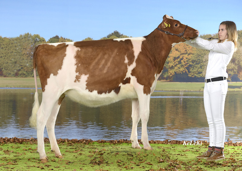 Hokovit Destined Sunset-Red owned by Hokovit Genetics has it all, high genomics, beautiful type and from a great cow family. She is the #5 R&W heifer in Switzerland for ISET with +1349! Beside her great genomics she has done great in the show ring, she was 3rd in her class at the Swiss National Show, the Expo Bulle. Her dam is the maternal sister to the heavily used bull Laron P in Germany and goes back to the Glen-Drummond Splendor cow family, the family behind many sires like Sympatico, Secure-Red, Mr Savage, September Storm, Durham Red & many more!