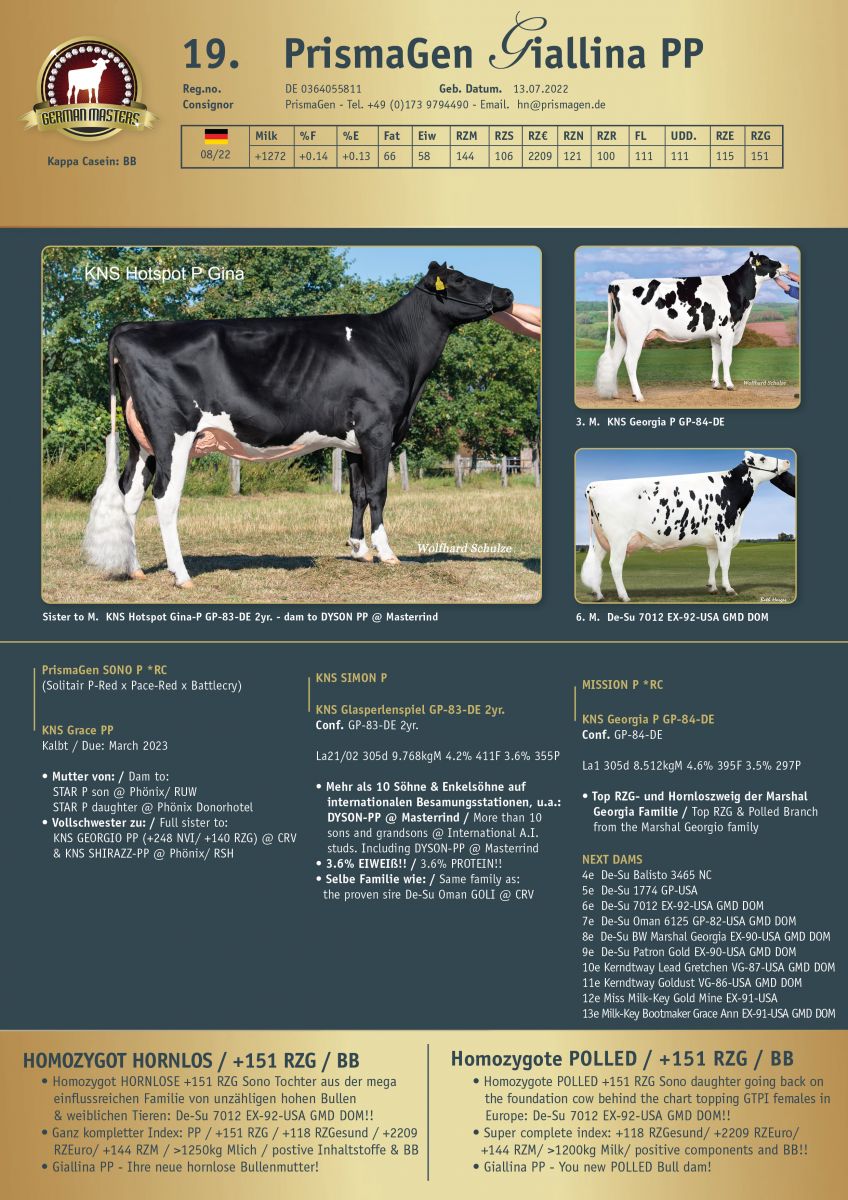 Lot 19. in the German Masters Sale 2022, October the 21nd, is Prismagen Giallina PP! This PrismaGen Sono P *RC daughter scores +151 RZG in Germany! She has a super complete index: +118 RZGesund / +2209 RZEuro / +144 RZM / >1200kg Milk / BB and postive components. Her dam is Simon P daughter KNS Grace PP, she is dam to a Star P son @Phönix/RUW and a Star P daughter @Phönix Donorhotel. Giallina PP her grand dam has more than 10 sons and grandsons in International A.I. studs including Dyson PP @ Masterrind. Prismagen Giallina PP is tracing back to the foundation cow behind the chart topping GTPI females in Europe: De-Su 7012 EX-92-USA GMD DOM! Gaillina PP will be sold this friday at the German Masters Sale 2022 in absentee!