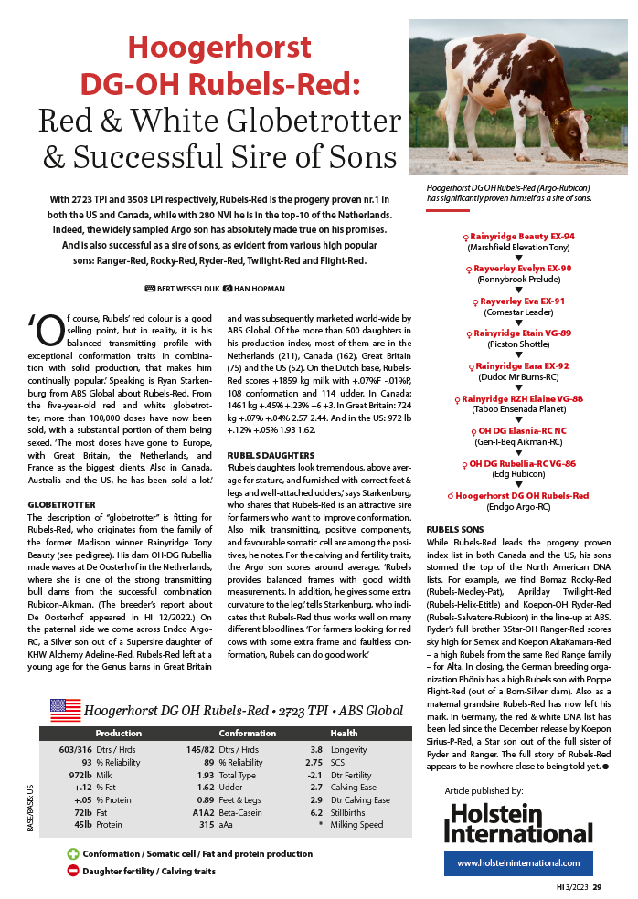 'Ofcourse, Rubels' red colour is a good selling point, but in reality, it is his balanced transmitting profile with exceptional conformation traits in combination with solid production, that makes him continually popular.' Speaking is Ryan Starkenburg from ABS Global about Rubels-Red! With +2741 GTPI, +146 RZG (#2 R&W RZG daughter proven sire), +240 RZG (#3 R&W Interbull daughter proven sire) and +3587 gLPI is Rubels-Red one of the highest R&W daughter proven sires in the US, Germany, the Netherlands and Canada (04/23). Indeed, the widely sampled Argo son has absolutely made true on his promises. He is also successful as a sire of sons, as evident from various high populair sons, like: Ranger-Red, Rocky-Red, Ryder-Red, Twilight-Red and Flight-Red!