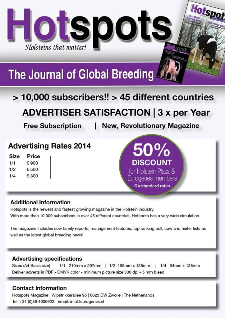 Reserve your advertising space for the 1st edition of the Hotspots in 2014 now! It promised to be a great edition with cow families about the Neblina- and Coyne Farm Jill cow families, THE source for the top ranking Genomic listings for males and females, the latest global breeding news, mating sire lists, show cow contests and more!