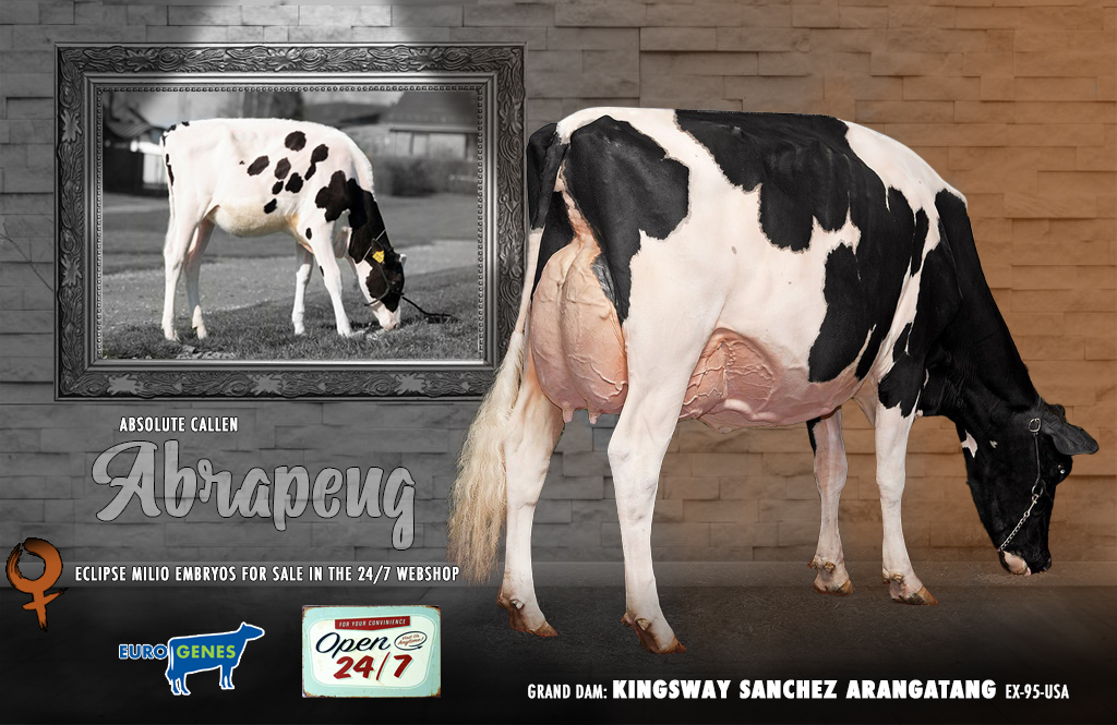 Selling in the 24/7 Eurogenes WEBSHOP are embryos by FEMALE Eclipse MILIO (+4.57 PTAT // +16 Conf.) from Kingsway Sanchez Arangatang EX-95-USA her +3.35 PTAT // +11 Conf. Callen grand daughter Absolute Callen Abrapeng! These embryos guarantee you a huge PA of: +3.96 PTAT & +14 Conf. The full sister to Abrapeng her dam was 1st in her section at the International Holstein Show, World Dairy Expo 2018! Unlimited TYPE possibilities with this great package selling in the 24/7 open market place!!