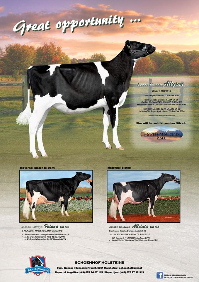 Again an incredible show opportunity from Schoenhof Holsteins (Austria) will sell this Saturday (November the 5th) in the Swiss Mountain High Sale, Lot #4, Jacobs Atwood Allyson, a March '16 Atwood from Jacobs Dundee Alysia EX-90-CAN, sister to the Res. Grand Champion of Madison '15: Jacobs Goldwyn Valana EX-95-CAN!! Click further for more information.