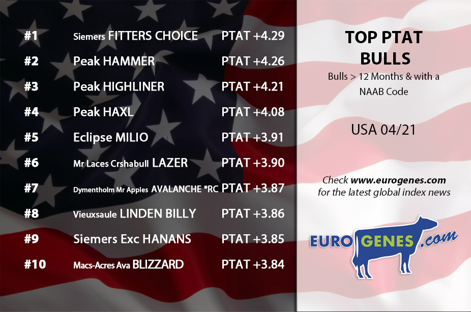 The new chart topper in the US system with NAAB-code is Genosource John-ETN breaking the 3000 GTPI at +3162 GTPI. In second follows his full brother Genosource Jack-ETN at +3162 GTPI and Genosource Captain at either +3162 GTPI. The new leader in the daughter proven GTPI list is the heavily used Hurtgenlea Richard Charl at +3050 GTPI, the first daughter proven bull to break 3000 GTPI!! For ahead in second follows Pine-Tree Burley at +2884 GTPI. Burley is followed by Achiever, Marius, Helix, Battle, King Doc and Medley. The #1 PTAT bull this index run is again Siemers Fitters Choice at +4.29 PTAT, he combines this extraordinary PTAT score with +2535 GTPI. Followed by Peak Hammer-ET(+4.26 PTAT) and Peak Highliner-ET (+4.21 PTAT). In the top RED CARRIER GTPI sire list we find again Aristocrat son Odessa-ET at the top at +2892 GTPI followed by his maternal brother by Herioc at +2891 GTPI. The R&W GTPI sire lists are leaded by Rubels-Red sons Ranger-Red (+2897 GTPI) and Rocky-Red (+2841 PTAT). Click further for the complete US-indexes.